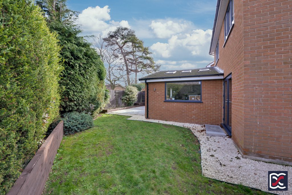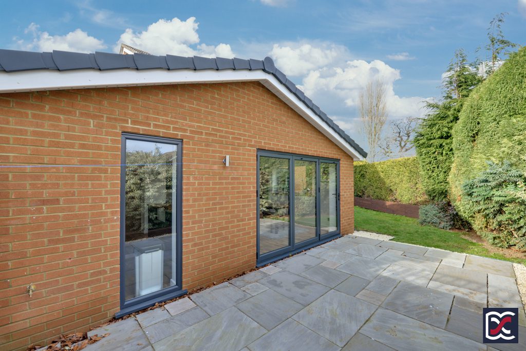 A lime shingle pathway to the left-hand side of the property leads to the rear garden which has close board perimeter fencing and established shrubs. A lawn area has been formed to the left-hand side of the garden and a large patio area has been created in front of the tri-fold doors leading to the open-plan kitchen.