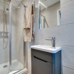The ground floor cloak room is accessed off the entrance hall and is fitted with a three-piece suite comprising contemporary WC with concealed cistern set within a modern base unit, wash hand basin with chrome mixer tap set within a matching vanity unit, and shower cubicle accessed via a folding tempered glass screen and fitted with rainfall shower rose and separate hose. Walls are finished with full height ceramic tilling and floors are finished with grey oak effect boards. Mechanical extract ventilation has been installed.