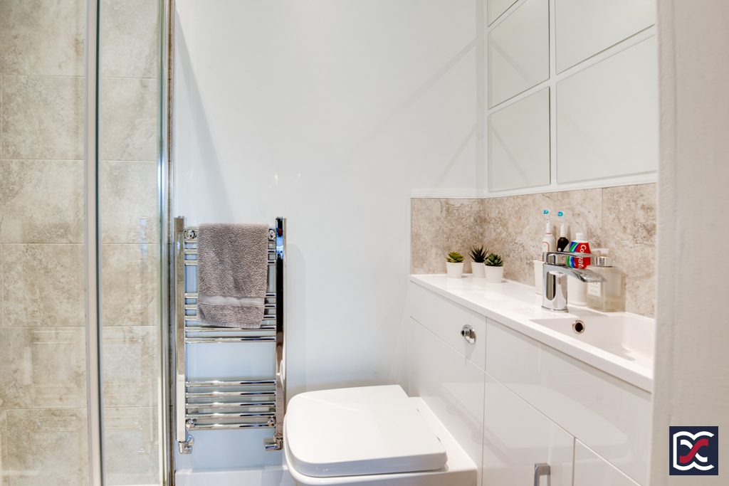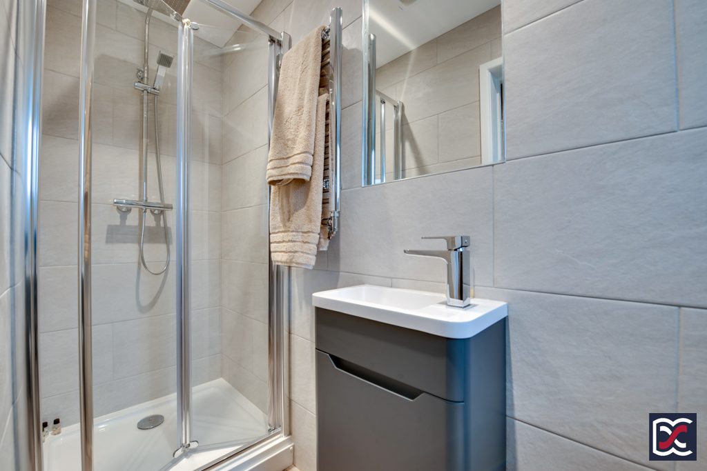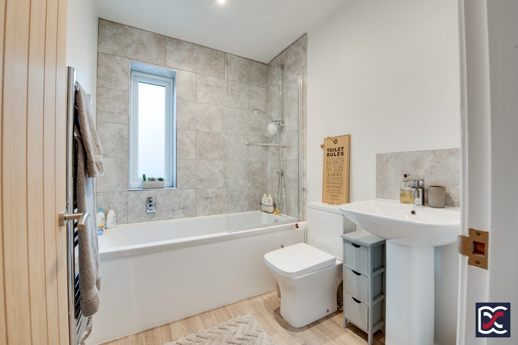 The master bedroom ensuite is fitted with a three-piece suite comprising contemporary WC with concealed cistern set within a vanity unit. The vanity unit also incorporates an inset sink with chrome mixer tap. The large shower cubicle has sliding tempered glass doors and is fitted with a rainfall shower rose. Walls to the shower are finished with marble effect full height tilling and floors are finished with light grey oak effect boards. Artificial lighting is provided by 2no recessed spotlights and mechanical extract ventilation has been installed.