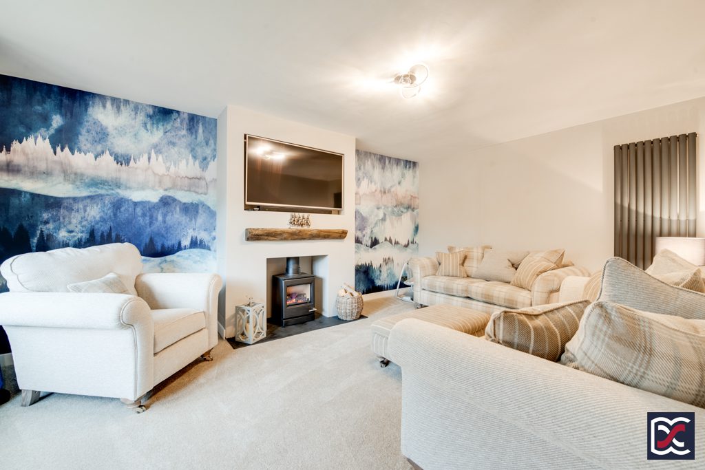 The main sitting room is located to the front left-hand side of the property and has an impressive segmental bay window providing natural lighting. The sitting room provides a calming space with feature fireplace incorporating oak effect mantelpiece and traditionally styled gas stove with slate hearth. Walls are tastefully decorated, and floors are finished with plush cut-pile carpet. Heating is provided by a vertical column radiator.