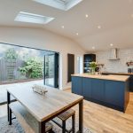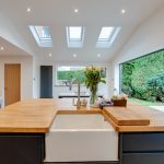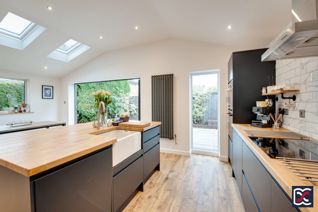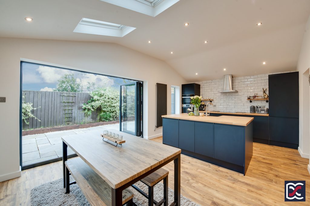 The part-vaulted rear extension accommodates a stunning open plan kitchen with large breakfast area and separate family snug with recessed niche for audio-visual entertainment. Floors are finished with antique oak effect boards and the high-vaulted ceiling has good natural lighting from three Velux roof lights. Further natural lighting is provided by a large casement window to the left-hand side elevation, a full height fixed window adjacent to the kitchen, and tri-fold double glazed doors which open onto the large patio area. Artificial lighting is provided from evenly spaced recessed spotlights.