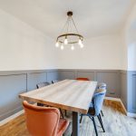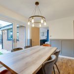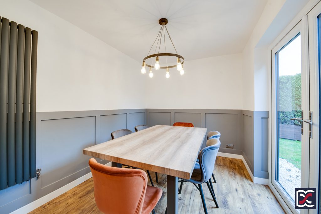 The dining room is located to the rear left hand side of the property and features newly installed double-glazed French doors opening onto the rear garden and providing good natural lighting. Floors are finished with antique oak effect boards which extend through from the open plan kitchen. Low level timber panelling has been fitted and there is a vertical column radiator and ample room for a large dining table and chairs.