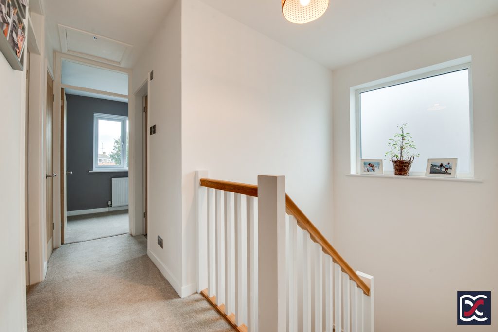 The part galleried first floor landing is fitted with plush cut-pile carpet which extends through to the bedrooms and has white painted solid timber balustrades and exposed oak handrails. There is a large fixed glazed window overlooking the landing providing natural lighting. Slatted effect solid oak doors lead to the bedrooms and bathroom. A linen cupboard has been provided and fitted with painted slatted shelves and incorporates a single panel radiator.