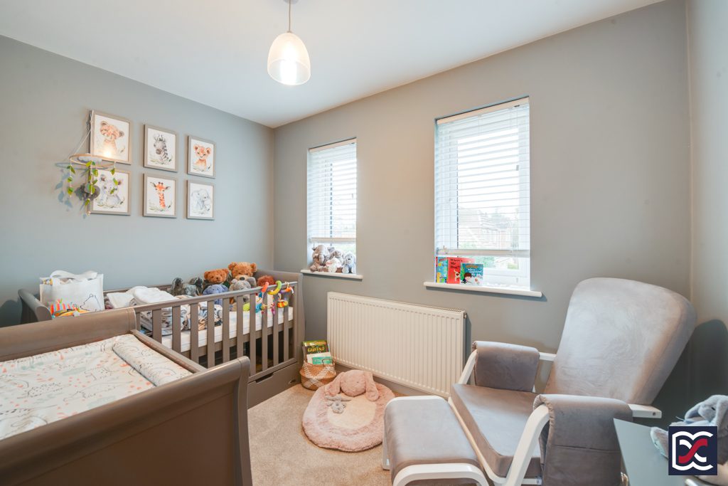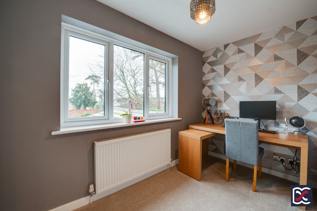 Bedroom four is a single bedroom currently used as an office and located to the rear right hand size of the property. It has a three-unit window overlooking the rear aspect and benefits from a large wardrobe with sliding mirrored doors. Walls are partly finished with tasteful decorative lining paper.