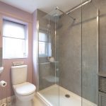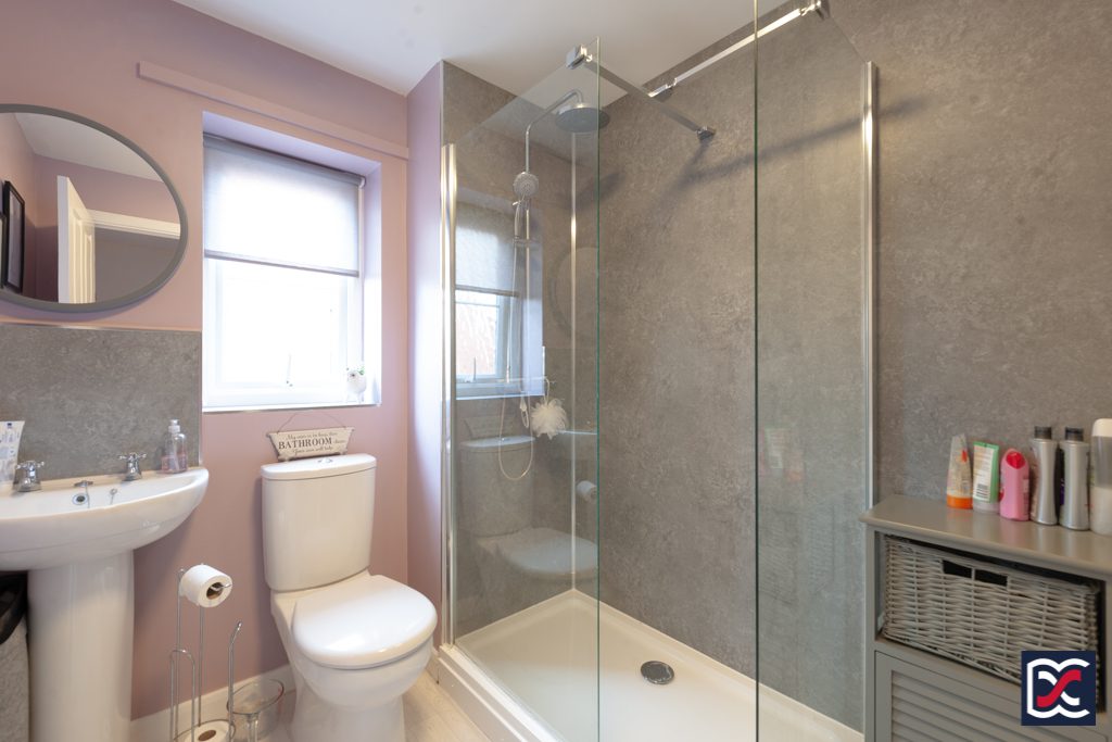 Fitted with light ash effect laminate floor boards and with a top hung double glazed window to the side elevation providing natural lighting and ventilation, the shower room is fitted with a 3-piece suite including ceramic wash hand basin with pedestal, close-coupled WC and large shower with glazed screens. Grey marble effect full-height aqua panels have been installed together with mechanical extract ventilation.