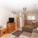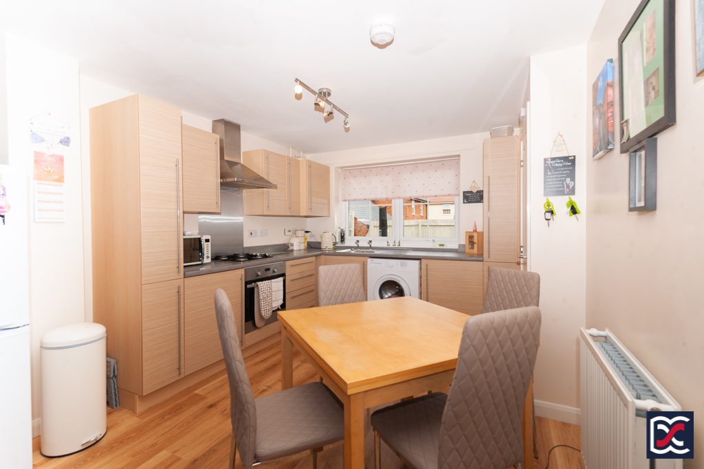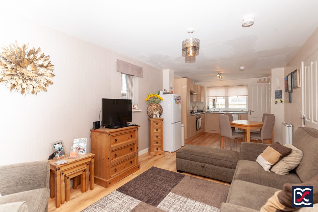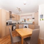 The dual aspect sitting room has lighting from double glazed windows and, again, is fitted with oak effect laminate boards. The sitting room leads through to the dining room/kitchen area where there is a useful under stairs storage cupboard.