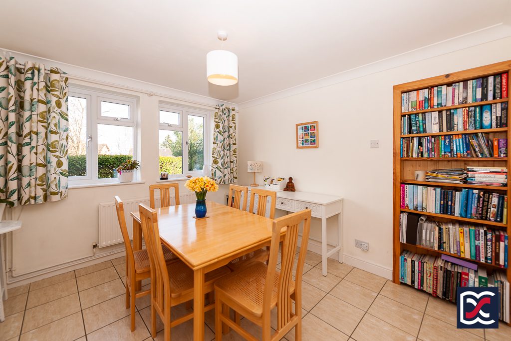 The dining room is located to the front right-hand side of the property and has marble effect tiles which flow through from the kitchen. It is a good-sized space with ample room for a large dining table and two separate windows to the front elevation overlook the communal green space. Built-in pine shelving has been formed to the previous door niche.