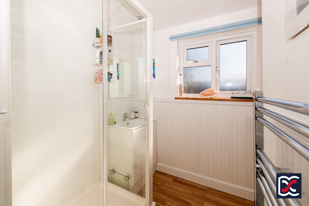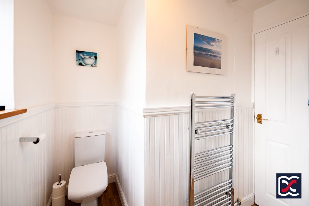 The first-floor shower room is fitted with a three-piece suite including contemporary close-coupled WC and wash hand basin with chrome mixer tap resting on a two-door vanity unit. The large shower cubicle has a sliding glazed screen and rainfall shower head together with additional shower hose. White ceramic wall tiling has been fitted around the sanitary appliances and timber panelling has been applied up to dado level. Floors are finished with timber laminate boards and there is a frosted, three-unit window to the side elevation providing natural lighting and ventilation.
