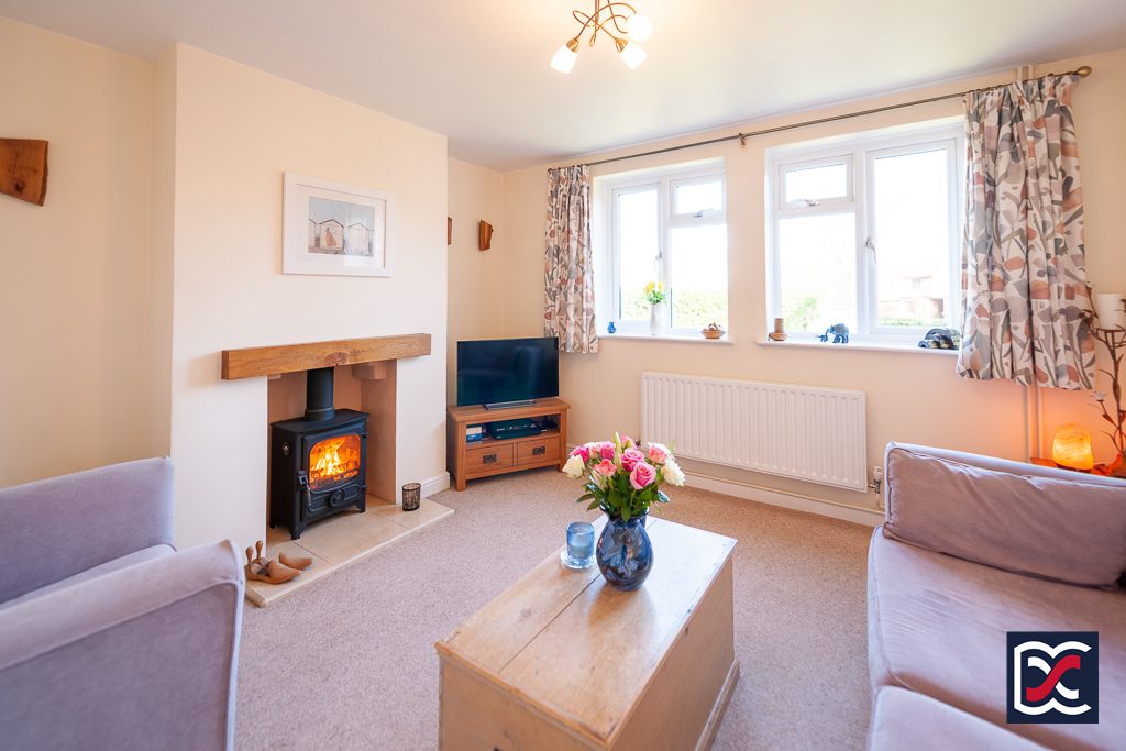Accessed off the tiled entrance hall, the sitting room has two windows overlooking the front garden and providing partial views of the countryside beyond. Floors are finished with cut pile carpet and the fireplace is fitted with a multifuel stove resting on a limestone hearth.