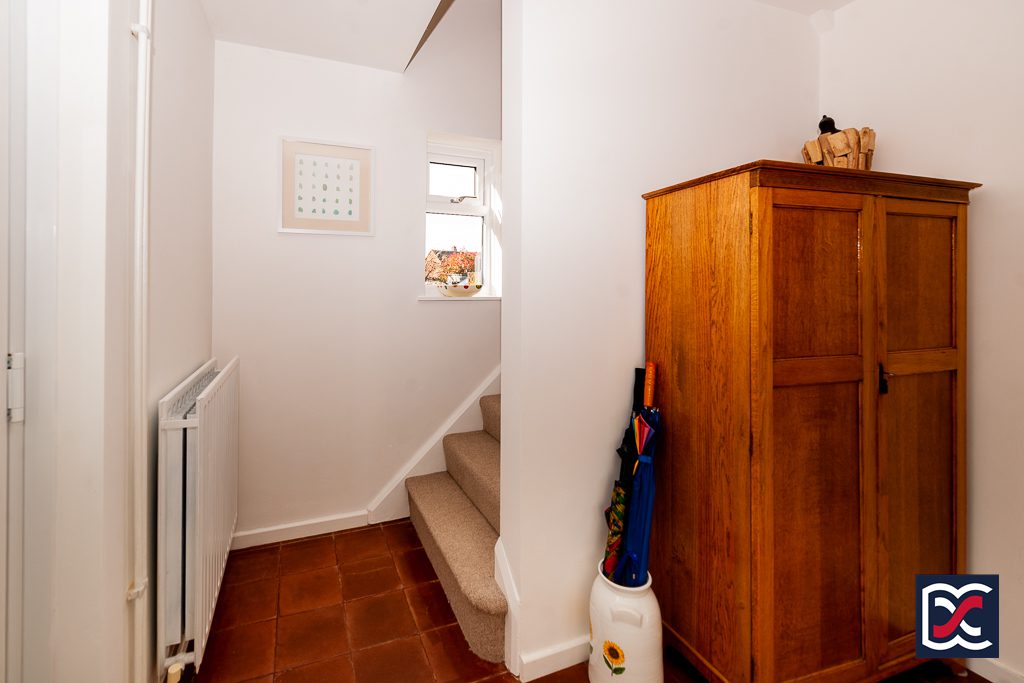 The main entrance is to the side elevation of the property with a four-panel door incorporating decorative upper glazing panes. The good-sized entrance hall has terracotta tile flooring and high ceilings which extend throughout the property giving a good sense of space. Panelled doors lead to the sitting room and kitchen and a flight of timber stairs with loop-pile carpet and upper half landing leads to the first-floor accommodation. A window to the rear elevation provides natural lighting and views onto the rear garden. A small low level, timber unit houses the gas and electric meters.