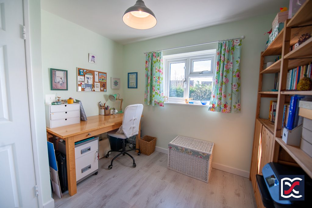 Bedroom 3 is currently used as a study area and has a three-unit window overlooking the good-sized rear garden. Floors are finished with light-coloured timber laminate boards.
