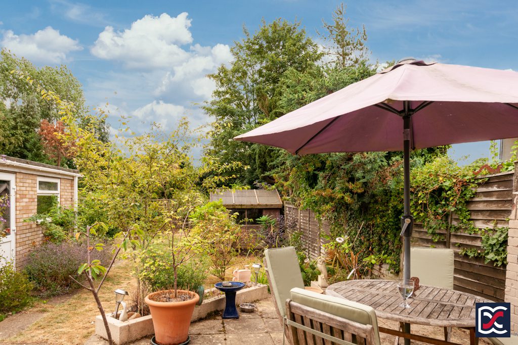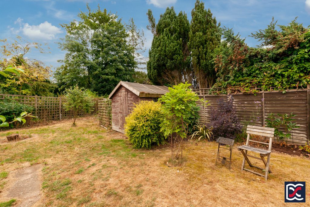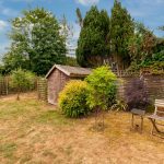 The rear garden has a raised patio area adjacent to the rear elevation and a large timber storage shed. There are a variety of semi-mature trees and established shrubs and plants.