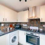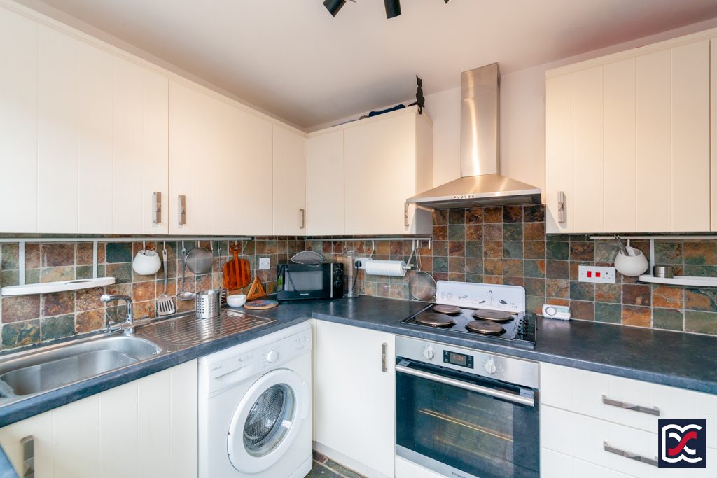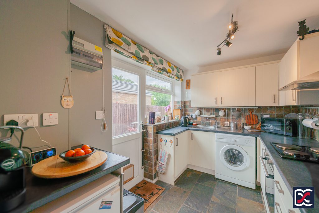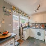 The kitchen is located to the left-hand side of the property and can be accessed from the driveway to the left-hand side elevation via a part-glazed door with large double glazed casement window. The kitchen is fitted with a range of cottage style base and wall units with roll top work surfaces, stainless steel sink with drainer, and electric oven with four burner hob and extract fan over. There is a built-in fridge freezer and space for a washing machine. The oil-fired floor mounted boiler is housed within a matching base unit with balanced flue to the side elevation.