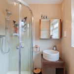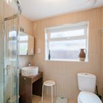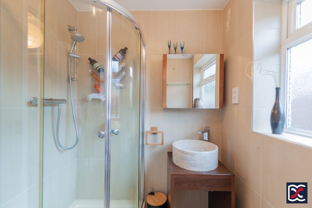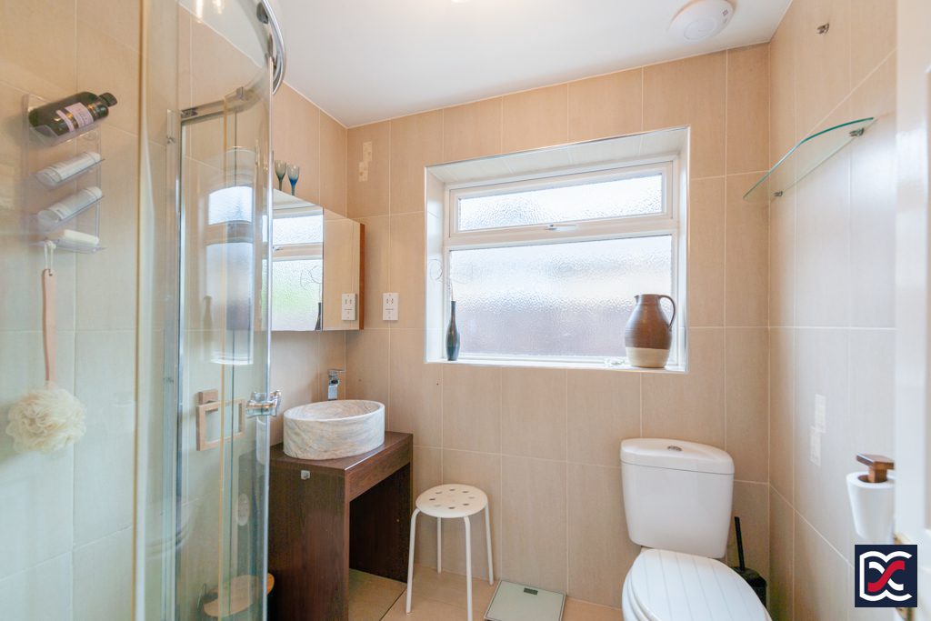 The family shower room has a three-piece suite comprising close-coupled WC, quadrant shower cubicle with sliding glazed screen, and contemporary marble basin with chrome mixer tap and vanity unit. Walls are fitted with full height ceramic tiling and there is a large top hung double glazed casement window with frosted glazing. Mechanical extract ventilation has been installed.