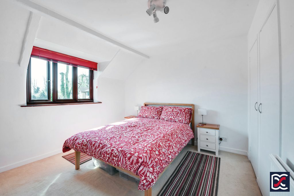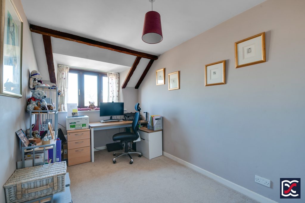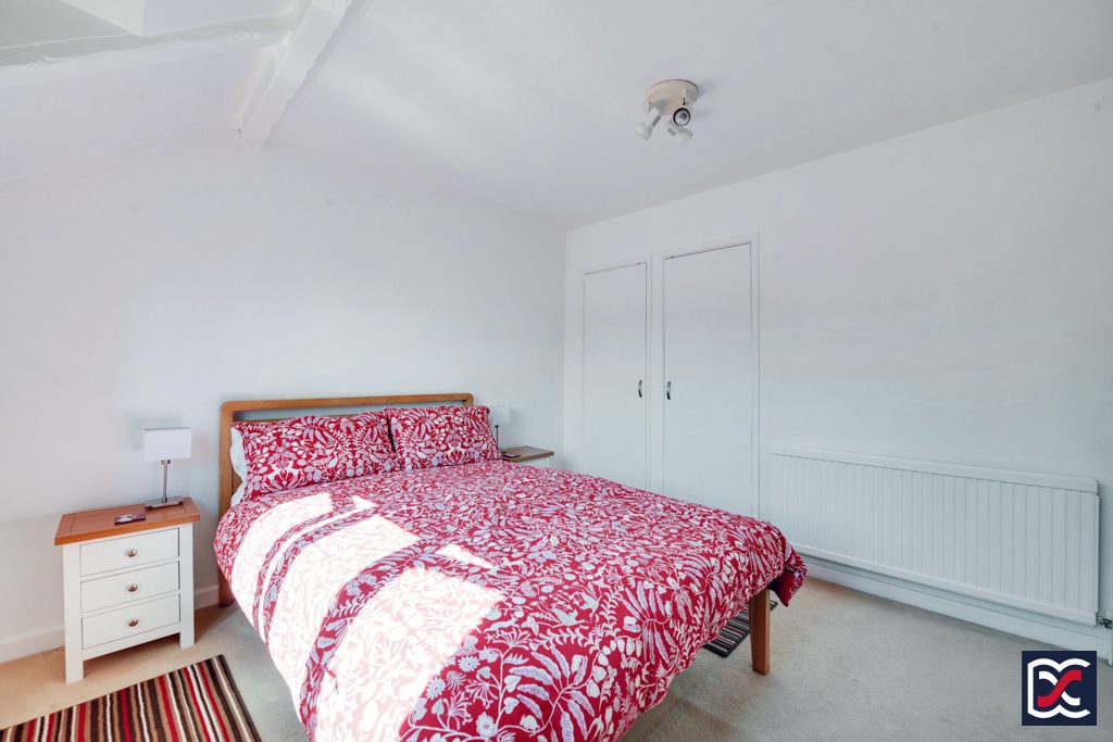 Bedroom two is located to the rear right-hand side of the property and has a three-unit window overlooking the southeast facing elevation and the rear garden. The part-vaulted ceiling has painted exposed timbers and this good-sized double bedroom also has built-in wardrobe space with shelving above. Floors are finished with cut pile carpet.