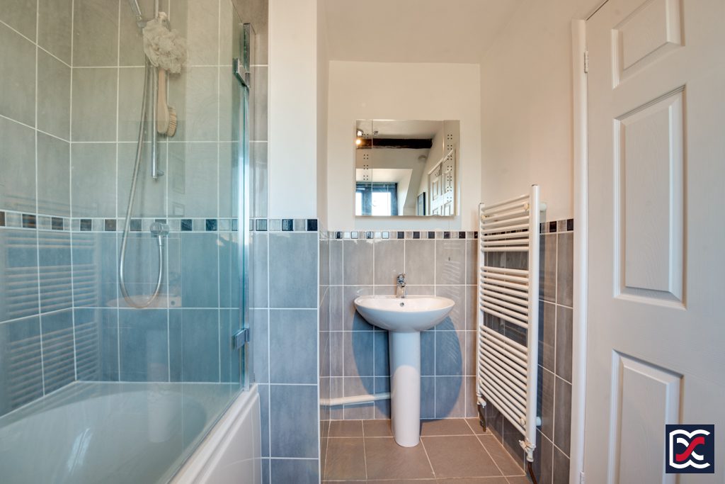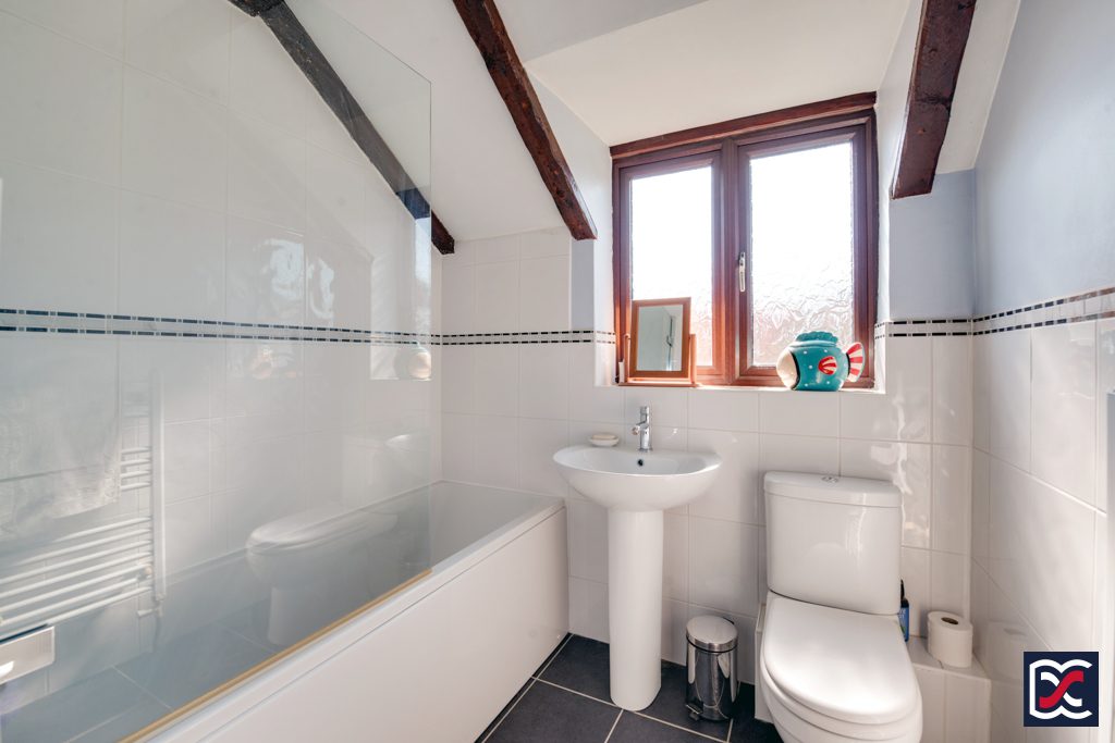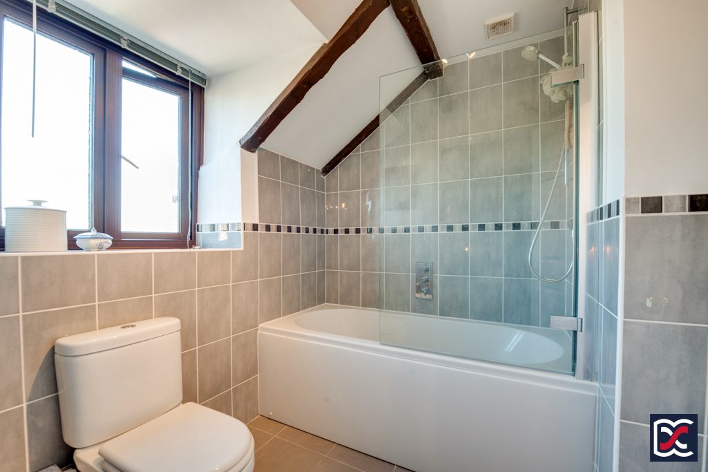 Fitted with a three-piece suite comprising bath with shower over, close-coupled contemporary WC, and ceramic wash-hand-basin with pedestal. Walls are partly finished with ceramic tiles and ceilings are part vaulted with exposed timbers. A two-unit double glazed window overlooks the front elevation providing natural lighting and ventilation.