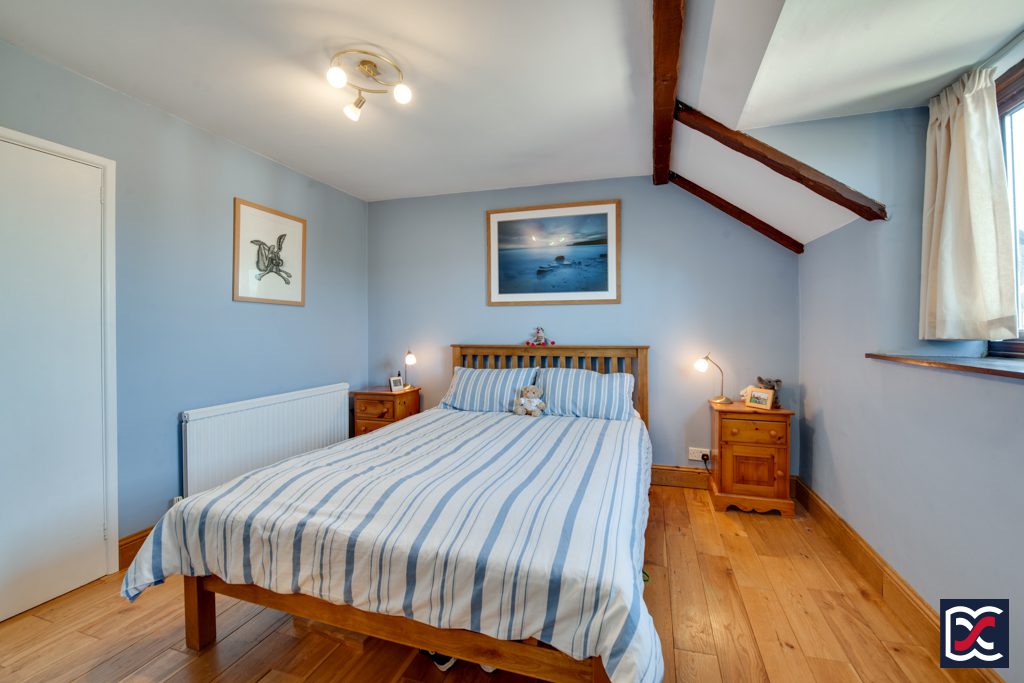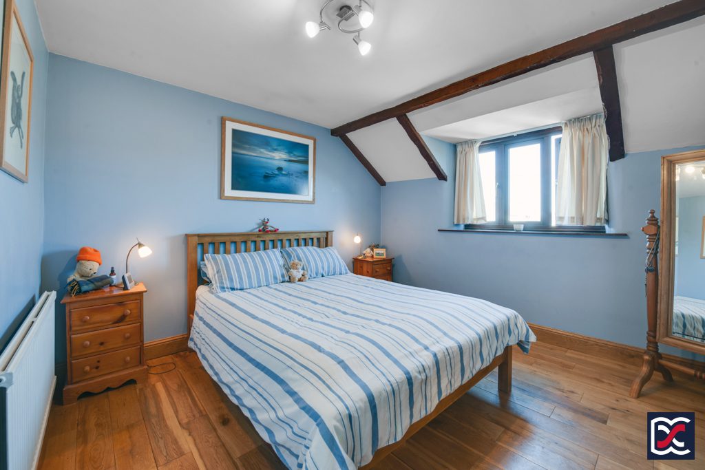 The master bedroom is located to the front right-hand side of the property and has a three-unit window overlooking the front aspect. Floors are finished with oak floorboards and the part-vaulted ceiling has exposed timbers. Storage is provided by a built-in wardrobe with upper shelving, accessed via two separate timber flush doors. A panelled door opens to the master bedroom ensuite.