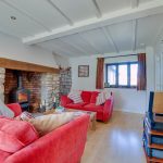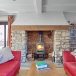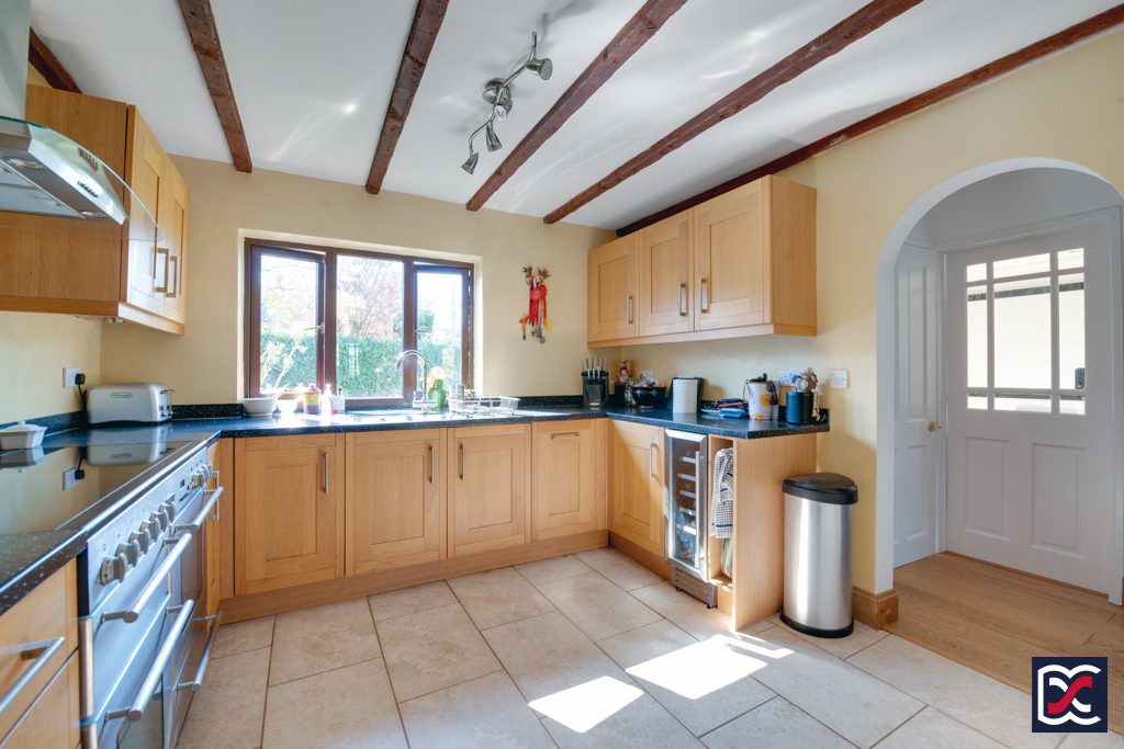 Located to the rear left hand side of the property and with a three-unit double glazed window overlooking the garden, the kitchen is fitted with a range of shaker-style oak-faced base and wall units with composite work surfaces and an inset stainless-steel sink with chrome mixer taps. Floors are finished with matching hard wearing Portuguese porcelain tiles and ceilings have exposed timbers.