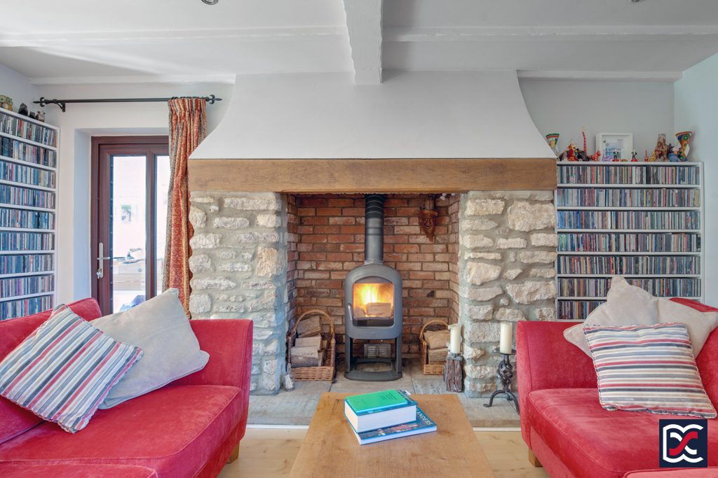 The sitting room is accessed via a part-glazed door from the entrance hall, and has timber laminate floorboards and exposed ceiling timbers. There is a large feature fireplace of dressed limestone and facing brick construction with a chamfered oak lintel over and fitted with a Jotul wood burning stove. Glazed double-swing doors with a matching side-lights lead to the family room, and a full-height glazed door opens to the utility area on the side elevation.