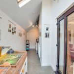 The utility area has a ceramic tiled floor and a mixture of white painted render and brick walls. This useful space houses the oil-fired boiler and has good natural lighting from two double-glazed Velux windows and double-glazed French doors which open onto the rear garden. A base unit with work surface has been fitted providing space for a washing machine. A timber flush door provides access to the attached single garage.