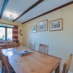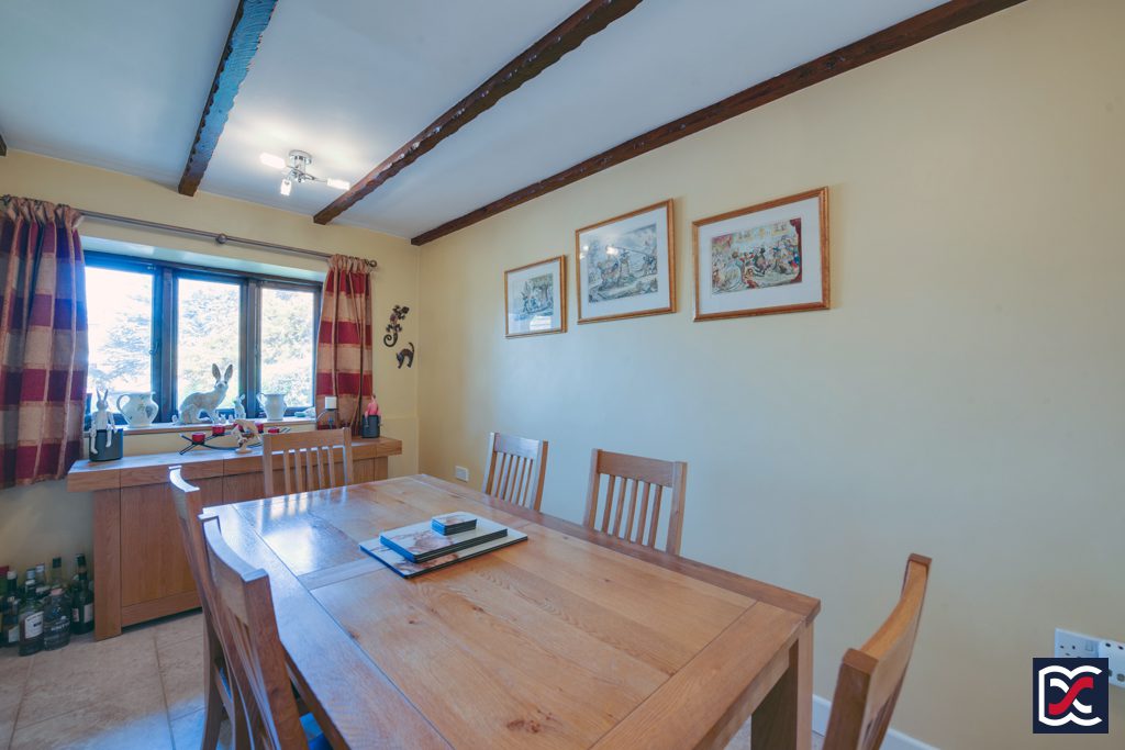 Accessed via a part glazed door from the entrance hall, the dining room has hard wearing Portuguese porcelain tile and a three-unit double glazed window overlooking the front aspect. Ceilings have exposed timbers and there is an arched opening leading to the kitchen.