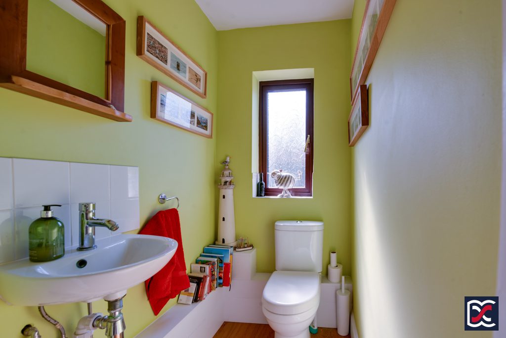 The ground floor cloak room has a single casement window providing natural lighting and ventilation. Sanitary fittings include comprise a close-coupled contemporary WC and matching wall-mounted wash hand basin with chrome mixer taps. Floors are finished with engineered oak boards which flow through from the entrance hall.