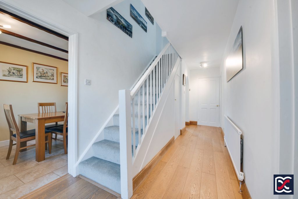 Accessed via a timber panelled door with matching double glazed side panel, the main entrance has a large, tiled canopy over and opens into an impressively sized entrance hall with engineered oak floorboards and four panelled doors opening to the principal ground floor accommodation. A straight flight of carpeted stairs with painted timber handrails and balustrades leads to the first floor accommodation and there is a useful understairs cupboard. Walls are neutrally decorated.