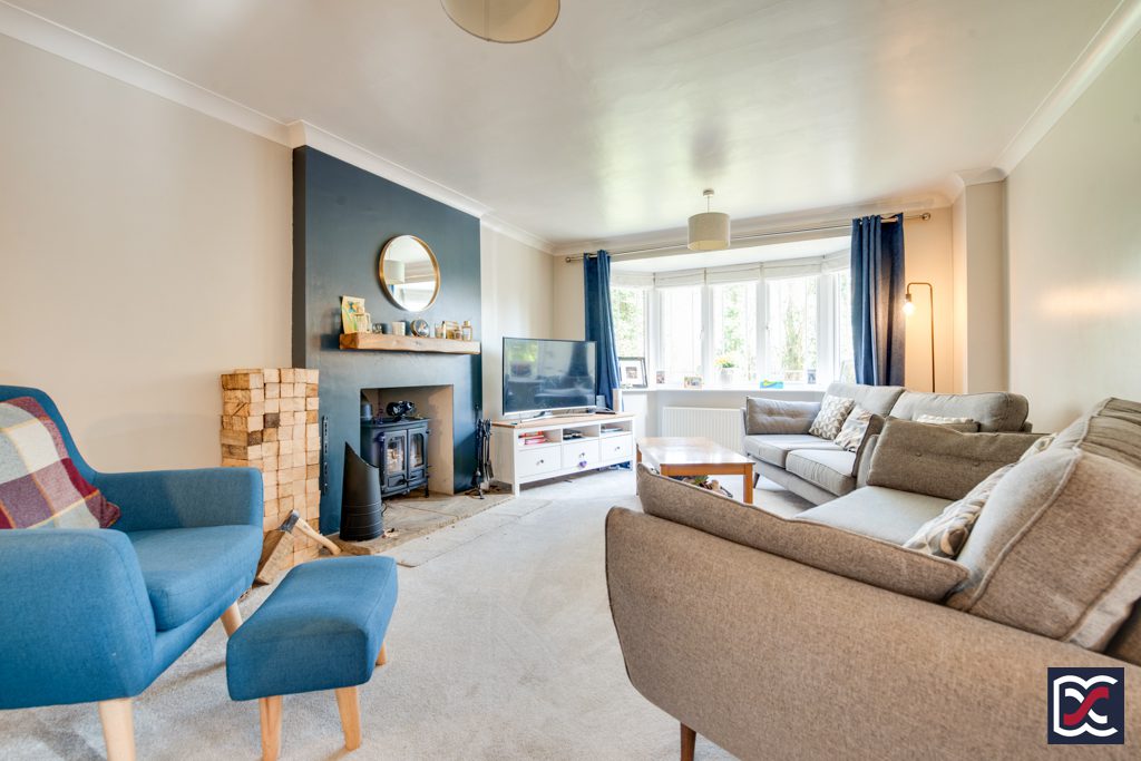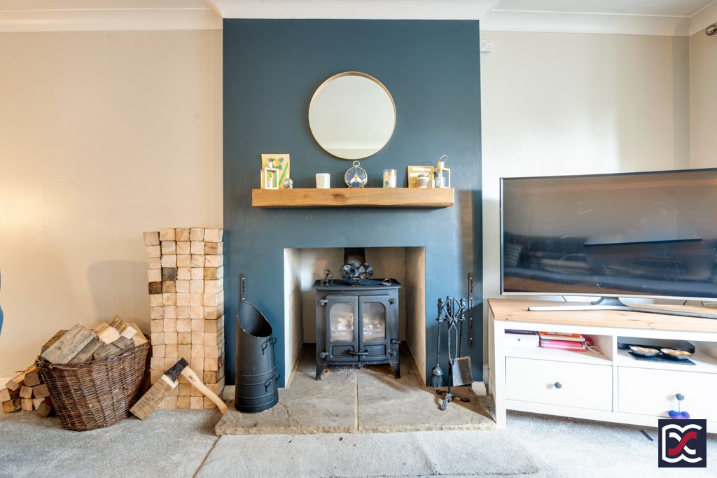 The sitting room to the side elevation of the property boasts a large bay window providing ample natural lighting and a log burning stove perfect for winter nights framed within a painted feature wall. There is space for two large settees, an armchair and dresser.