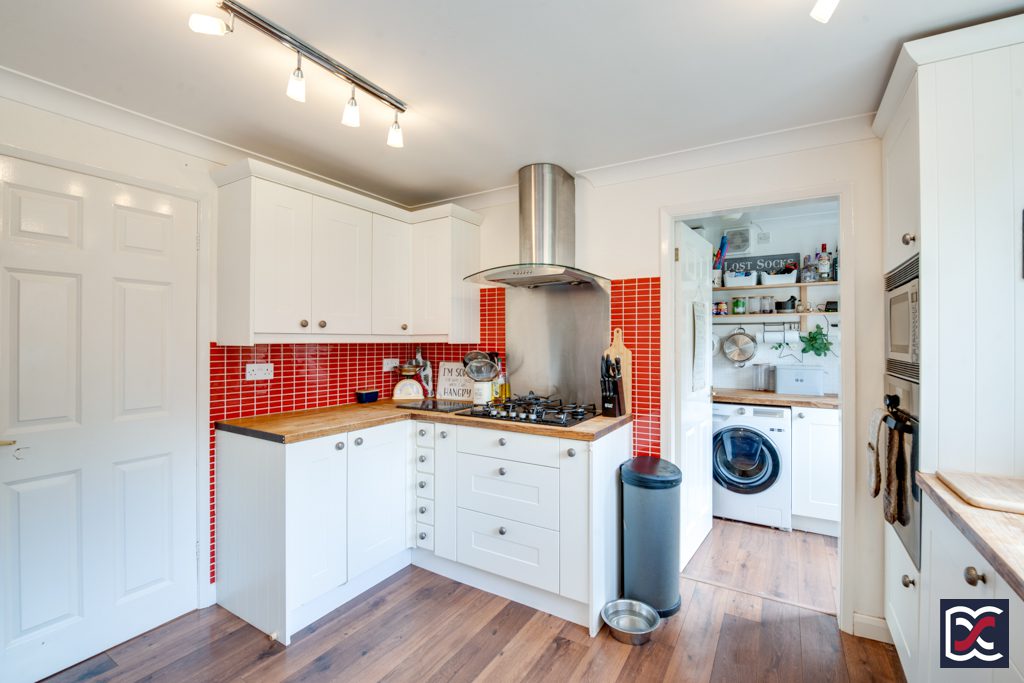 The kitchen / breakfast room is a perfect family space for cooking, socialising and making sure that homework is done! There is room for a large table and chairs in front of the French doors leading to the garden, a breakfast bar and large kitchen area with good storage, a built in oven and gas hob and space for a fridge freezer.