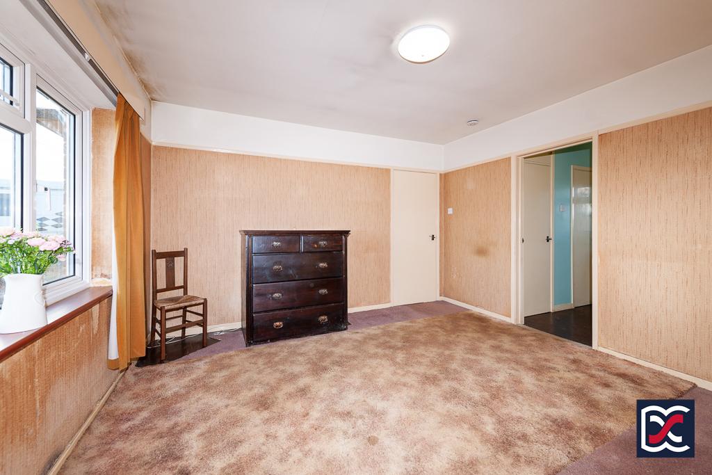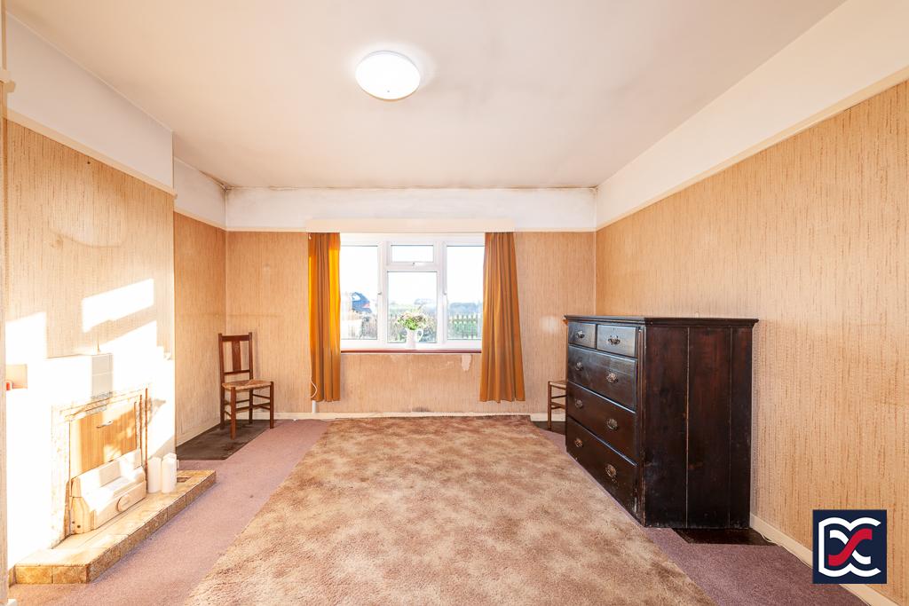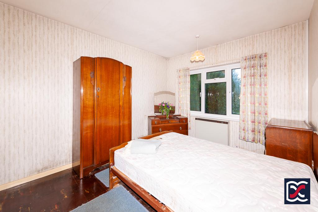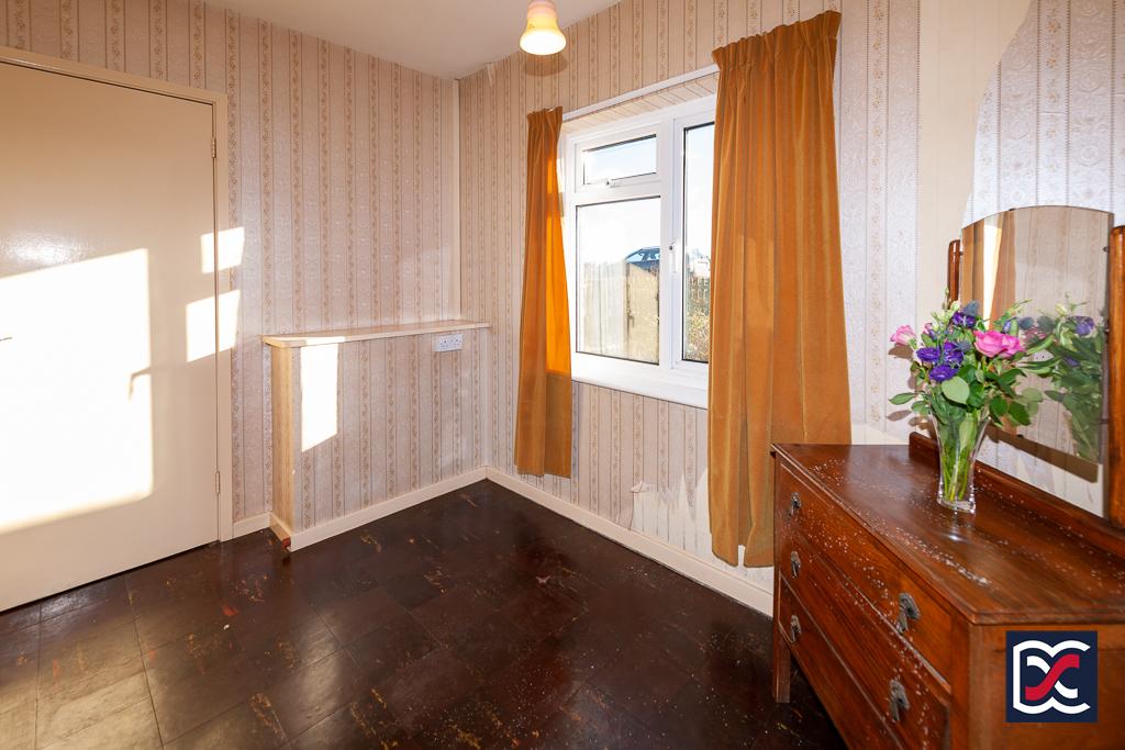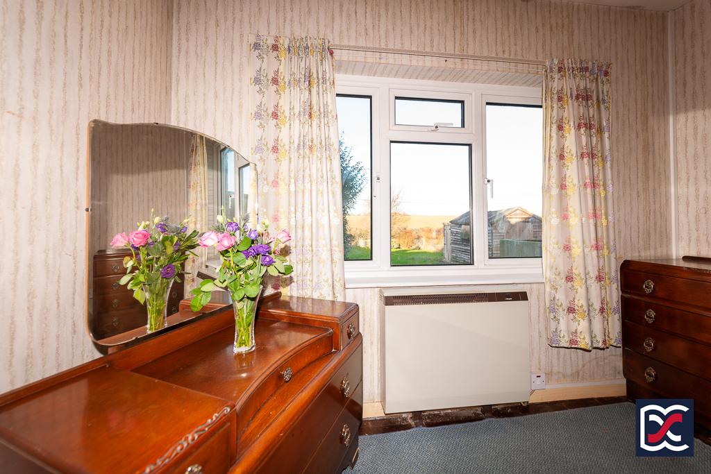 The main bedroom is a double bedroom to the rear left-hand side of the property. It has a three-unit double glazed window overlooking the rear garden with splendid onward views across open fields. Again, there is an open fireplace with tiled hearth and surround and enamelled fire grate together with an electric storage heater. An original built-in wardrobe with double swing doors has been provided and there is a good-sized cupboard with shelving above.