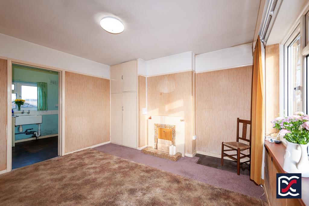 Located to the front right-hand side of the property, the sitting room has a three-unit double-glazed window providing natural lighting and wonderful south facing panoramic views. The sitting room contains a central open fireplace with tiled hearth and surround and enamelled fire grate. The fireplace opening is currently boarded over, and the fire has not been used for some time. There is a good-sized cupboard with double-swing doors which houses the hot water cylinder. A timber flush door leads to the kitchen.