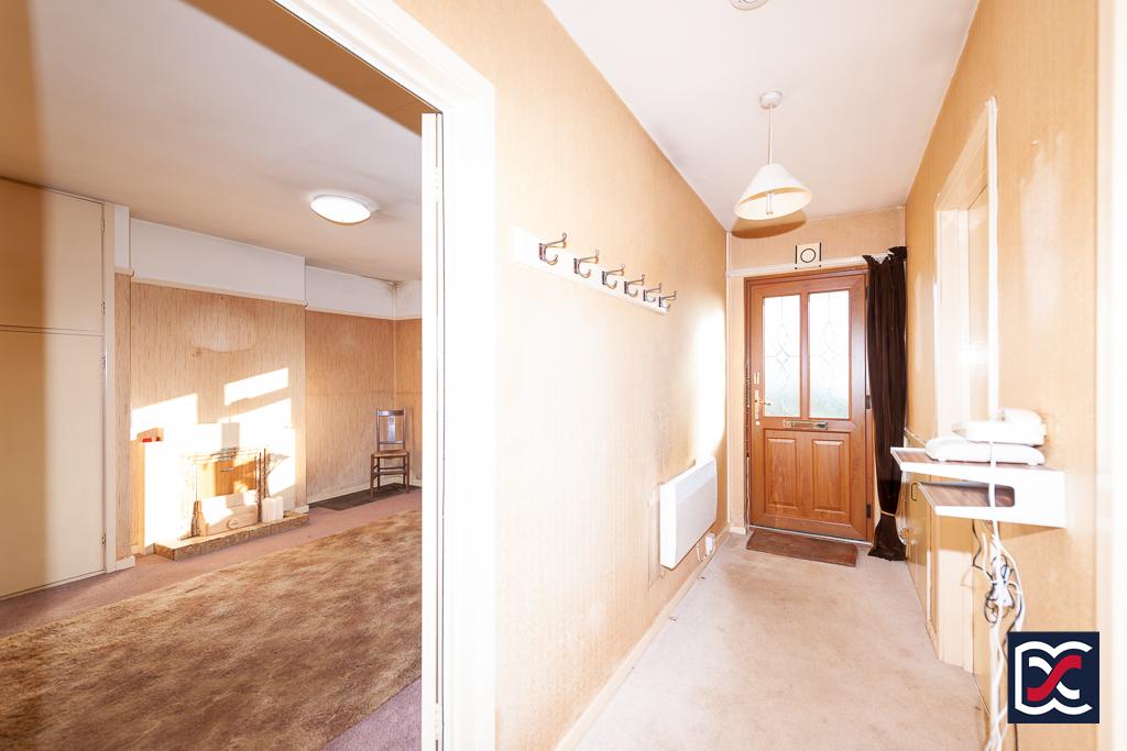 The entrance hall is accessed via a panel effect door with projecting canopy over. Being of a generous width the hallway provides space for coats with additional storage space to a low-level cupboard which houses the electricity meter. Flush, timber doors lead to the principal rooms and there is a timber ceiling hatch providing access to the roof void. Heating is provided by an electric storage heater.