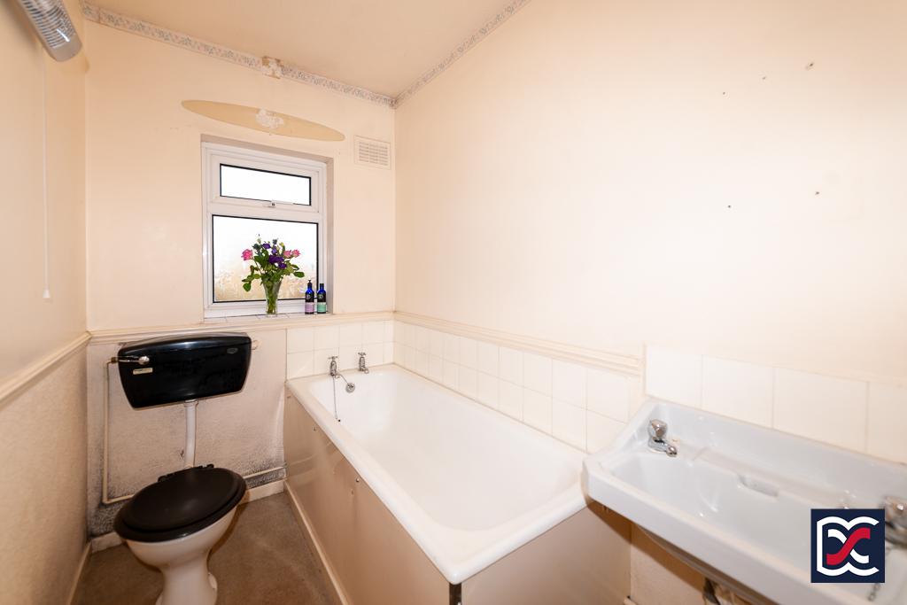 The bathroom is accessed from the entrance hall and is located to the rear of the property. Natural lighting is provided by a frosted casement window and there is a three-piece suite comprising enamelled steel bath tub, wall mounted wash hand basin, and WC with low-level Bakelite cistern. Heating is provided by a wall mounted electric bar heater.