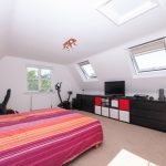 Bedroom two is located to the front of the property and is a large dual-aspect double bedroom with natural lighting from Velux roof lights to the side elevation and a large two-unit window to the front elevation overlooking the green. Floors are fitted with cut-pile carpet and the part-vaulted ceiling and walls are neutrally decorated. There are two, separate, large built-in wardrobes with clothes rails and fitted shelving.