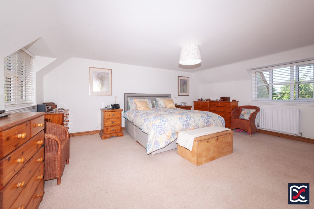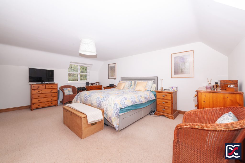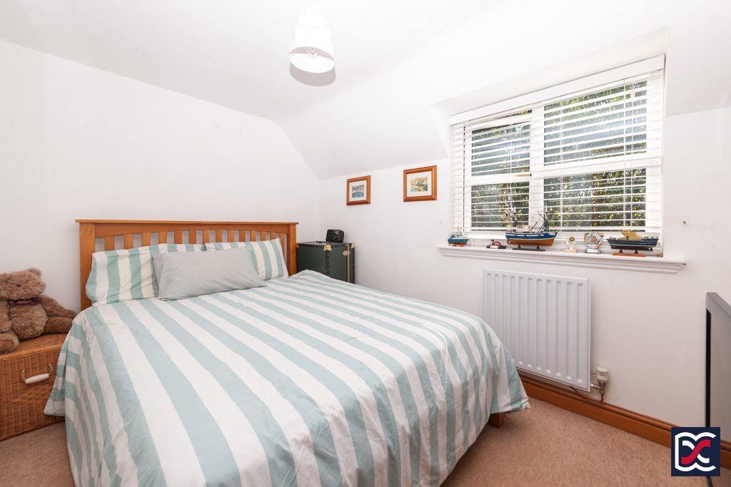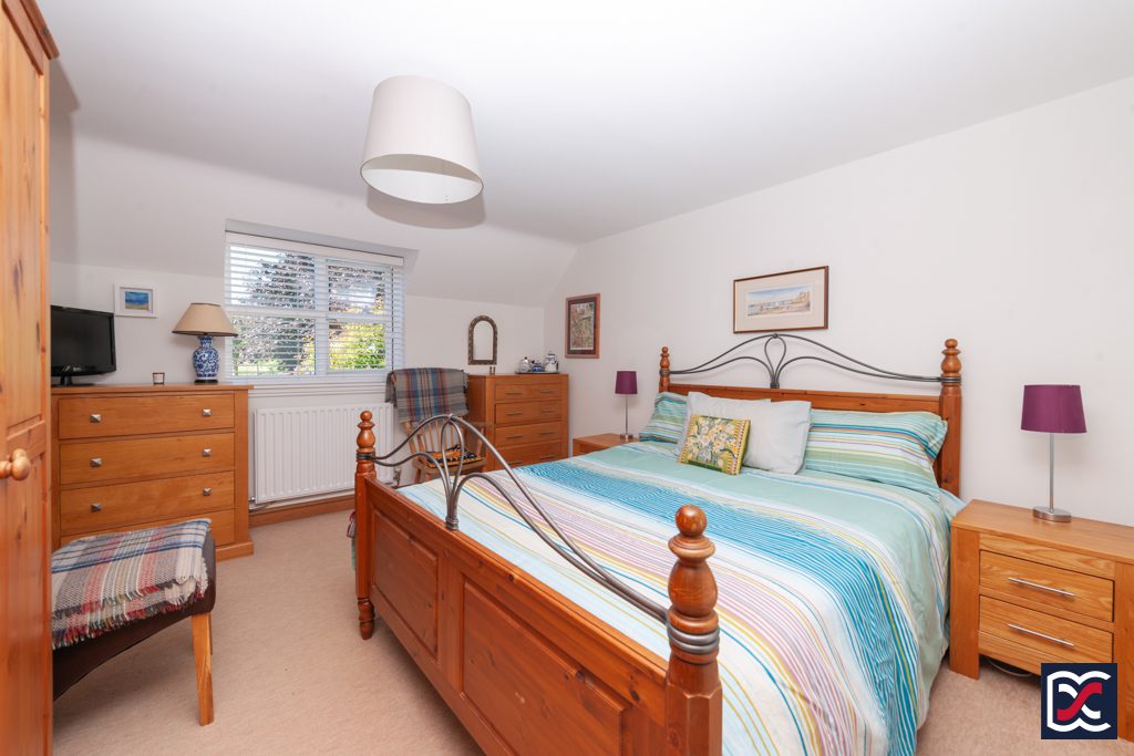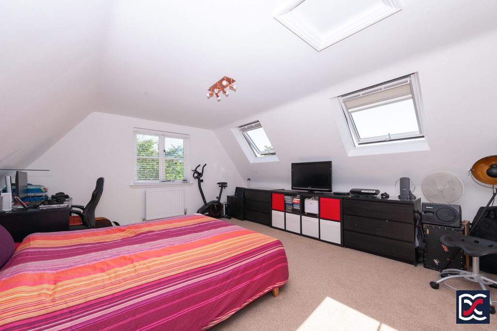 A further double bedroom located to the rear right-hand side of the property with a dormer window overlooking the rear garden. The part-vaulted ceiling and walls are neutrally decorated and floors are finished with cut-pile carpet. A pine door opens to a large wardrobe with fitted clothes rail and upper shelving.