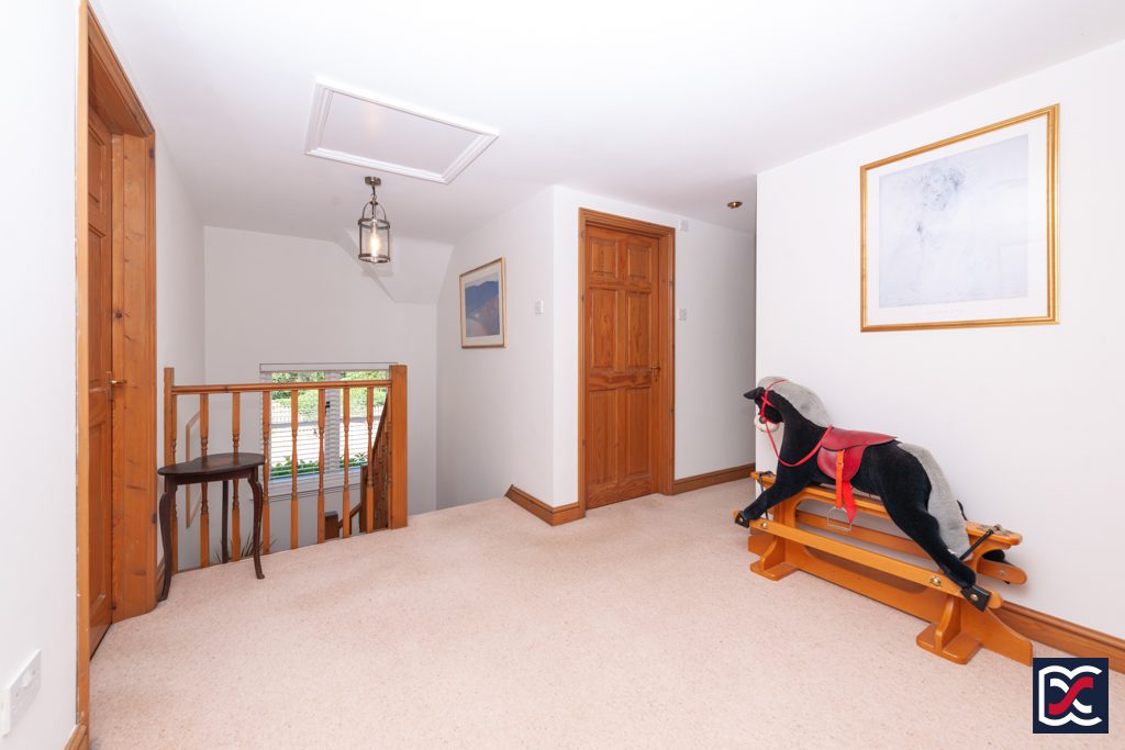 The large, galleried, first floor landing has natural lighting from a four-unit window to the side elevation and there is a hinged ceiling hatch providing access to the roof void. Floors are fitted with cut-pile carpet and pine doors open to the bedrooms and the family bathroom. There is a useful, large airing cupboard with slatted shelving and walls are neutrally decorated.