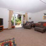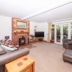 The dual-aspect sitting room has an abundance of natural light from a two-unit window overlooking the front green and French doors which open onto a delightful patio area overlooking the rear garden. Floors are fitted with plush, cut-pile carpets and walls are neutrally decorated. There is a feature brick and Pury End stone fireplace with multifuel stove and terracotta tile hearth. Artificial lighting is provided by perimeter wall lights.