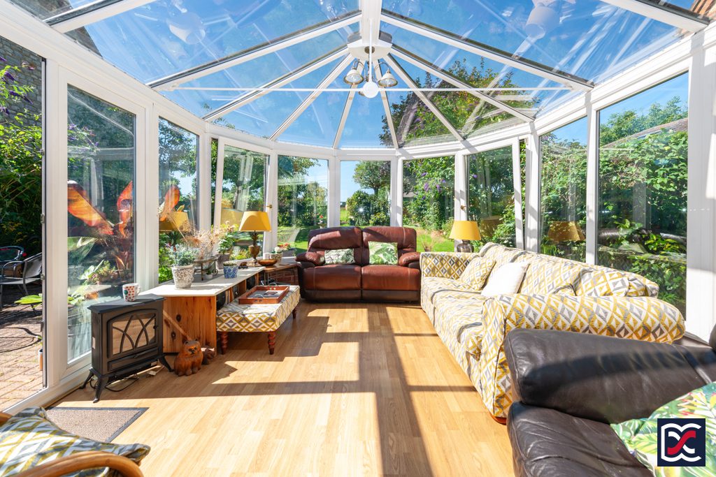 A large, Georgian-styled conservatory with double-glazed hipped roof incorporating decorative tie-bars and a Velux window. Floors are finished with oak-effect boards and French doors open onto the patio area making this a perfect space for entertaining and alfresco dining.