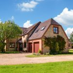 The large double garage is located to the front of the property and is fitted with power and lighting. The galvanised, steel-framed up-and-over doors have solid timber, slatted panels and there is a separate, pedestrian door opening onto the side elevation.