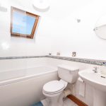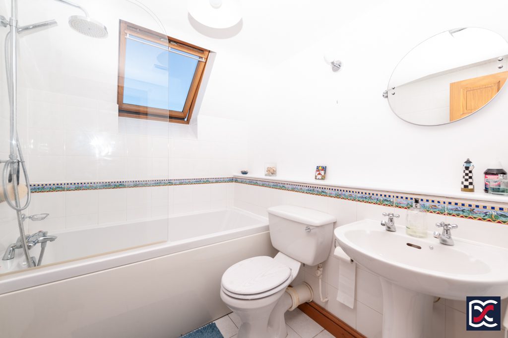 Fitted with a three-piece suite comprising bath with shower over, large ceramic wash hand basin with pedestal and chrome mixer tap, and close-coupled WC. Walls have half-height, white ceramic tiling with mosaic banding and floors are fitted with ceramic tiles. Natural lighting is provided by a Velux rood light to the part vaulted ceiling and mechanical extract ventilation has been installed.