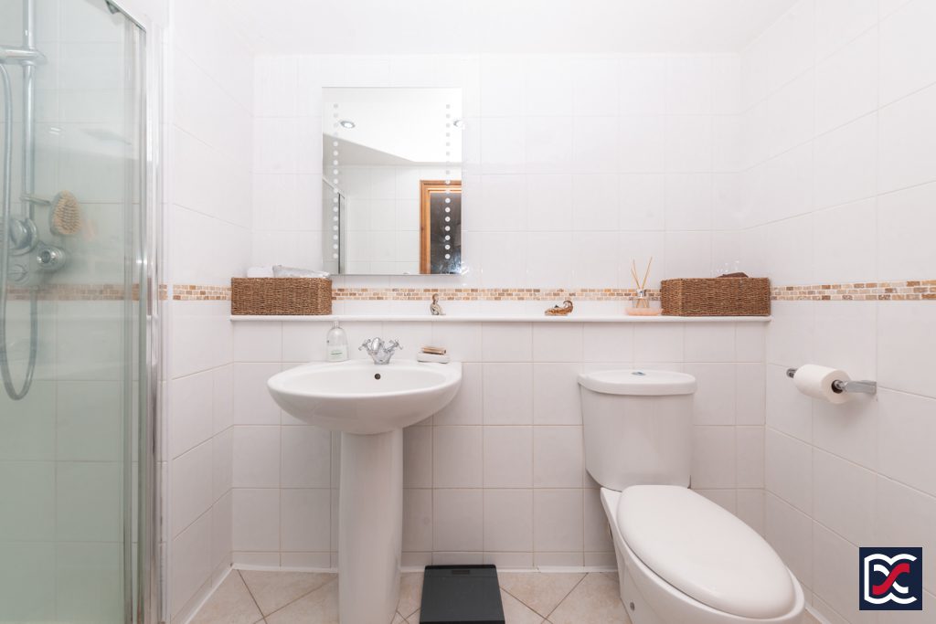 Fitted with a three-piece suite comprising shower cubicle with sliding, glazed screen, large ceramic wash hand basin with pedestal and chrome mixer tap, and close-coupled WC. Walls have full-height, white ceramic tiling with buff, stone mosaic banding and floors are fitted with limestone effect ceramic tiles. Artificial lighting is provided by recessed spotlight and mechanical extract ventilation has been installed. Heating is provided by a chrome ladder towel rail.