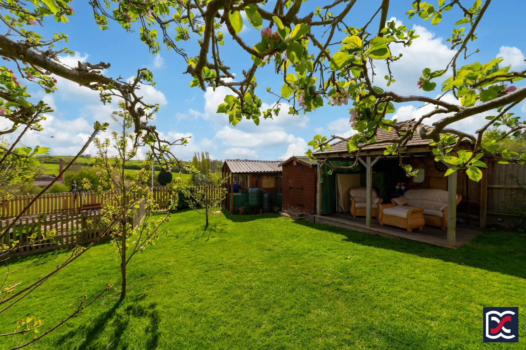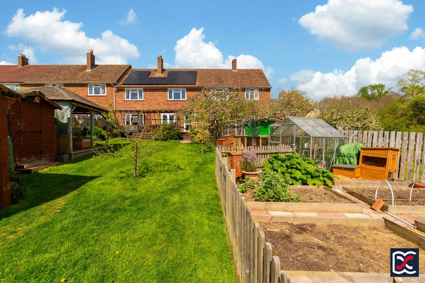 Practical storage is provided by two substantial timber sheds and a greenhouse. The larger shed has power and lighting, while the smaller shed is also fitted with lighting, making the space well suited to storage, potting and general garden use.