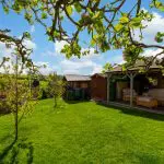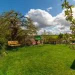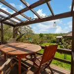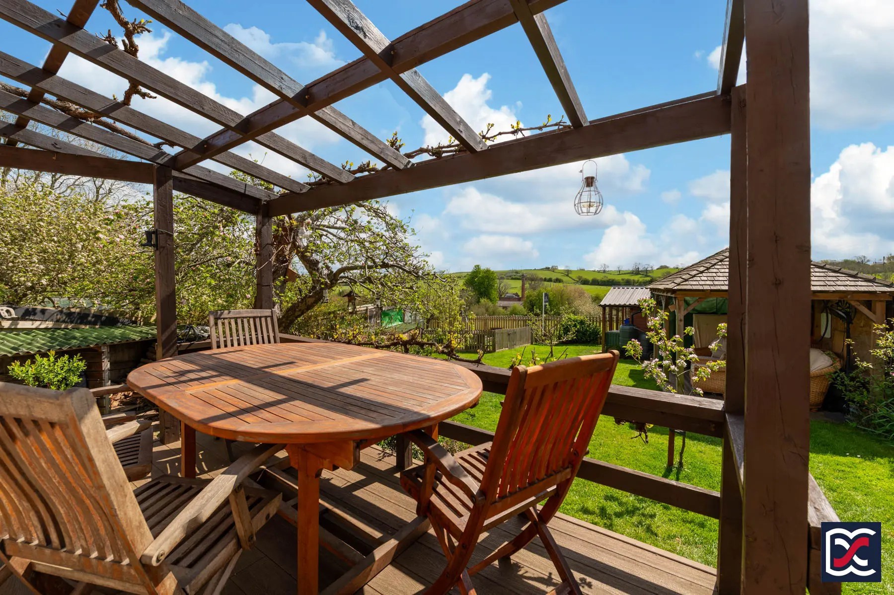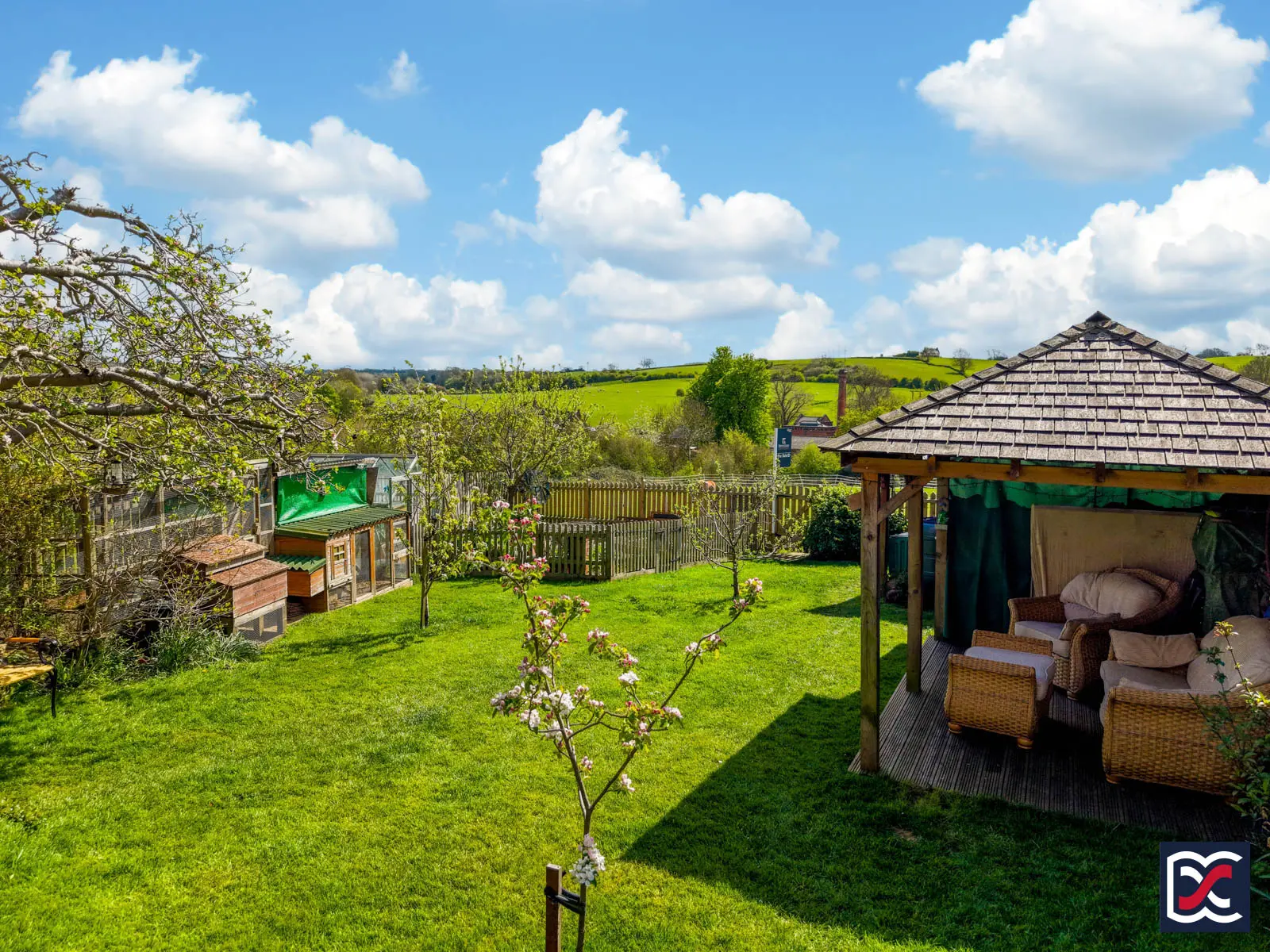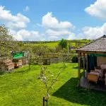 A further timber-built garden pavilion with shingled roof and decked seating area provides an additional outdoor sitting space, positioned to enjoy the open outlook. The garden also has a productive element, with a selection of established fruit trees including cooking and eating apples, plum and pear. A separately enclosed kitchen garden includes raised vegetable beds with paved and brick-edged paths between.
