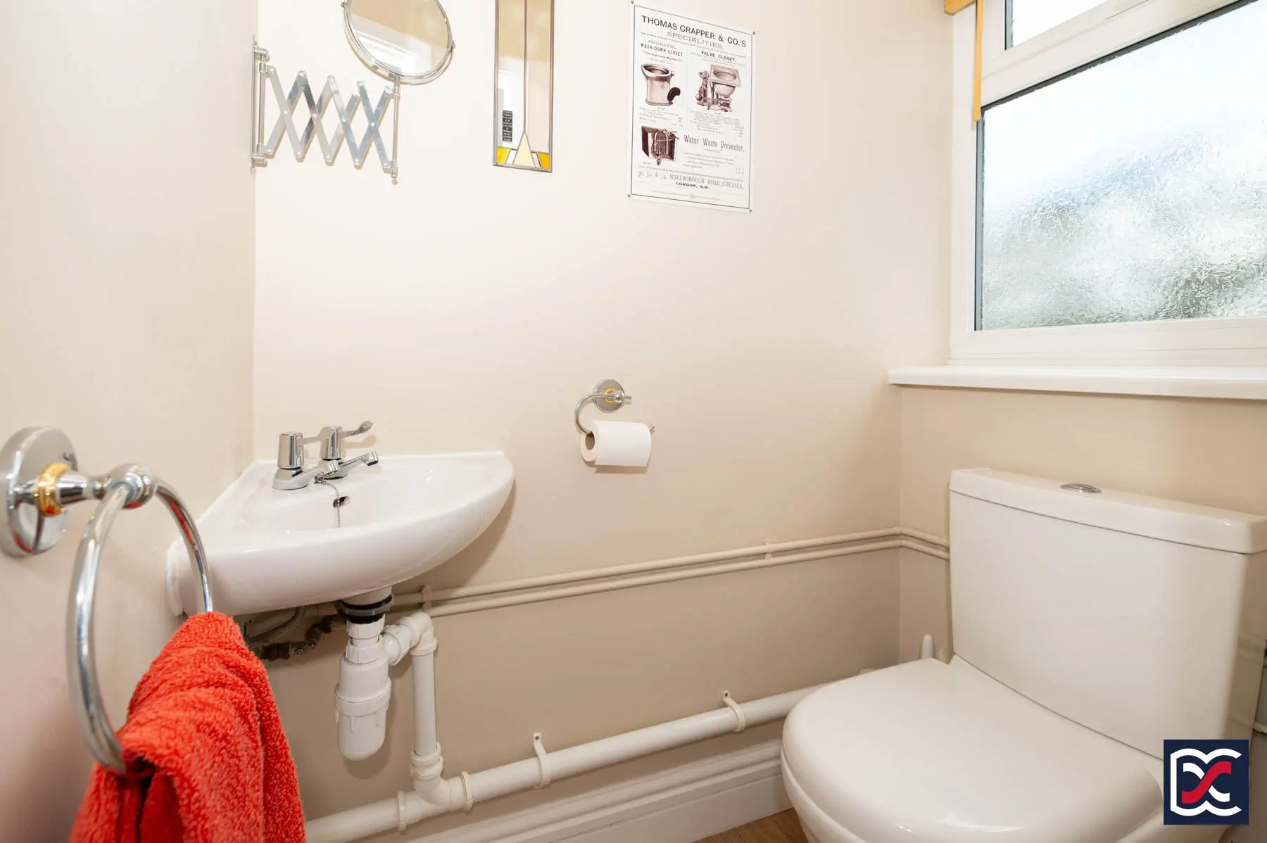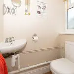 The ground floor cloakroom is neutrally decorated and continues the oak-effect flooring from the adjoining utility space. It is fitted with a close-coupled WC and a ceramic corner wash hand basin with chrome pillar taps. Natural light is provided by a top-hung frosted casement window to the rear.