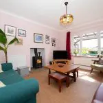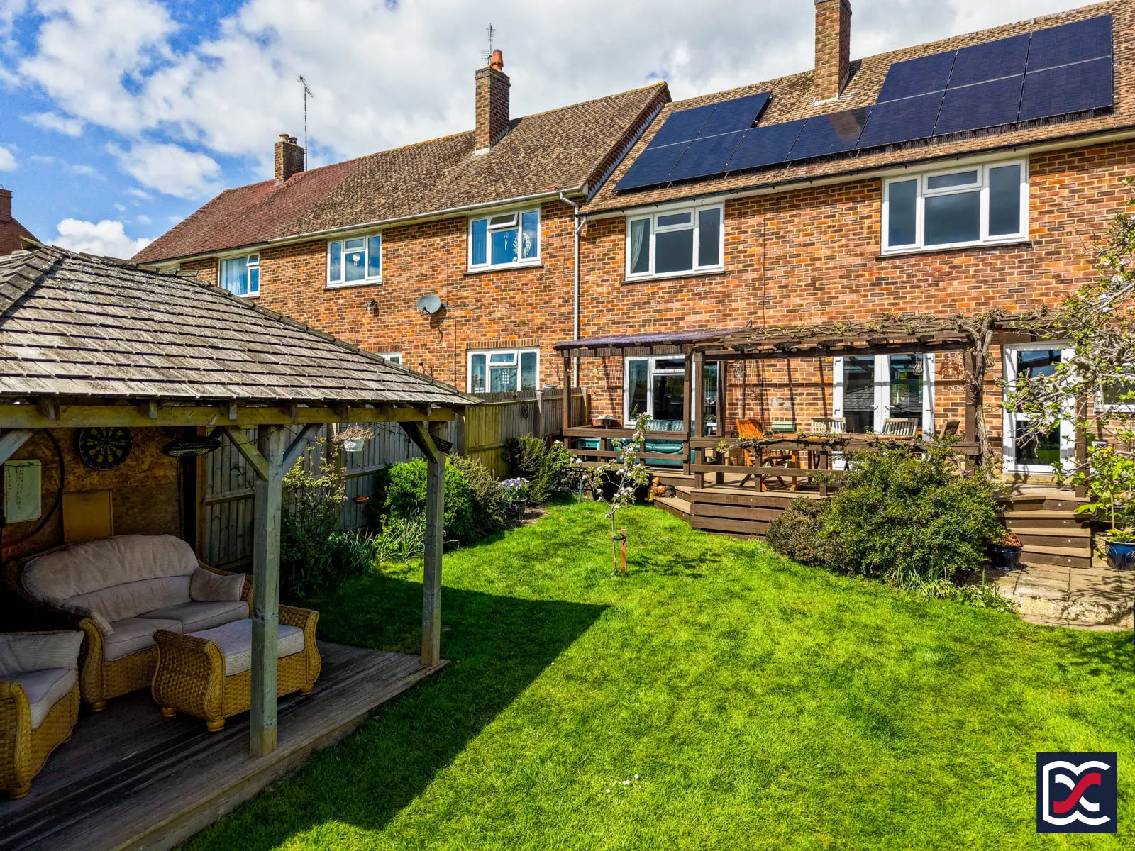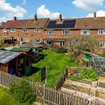 The accommodation extends to approximately 112sqm and is well presented throughout, with a good standard of finish and carefully chosen fittings. The layout includes two reception rooms, a kitchen/breakfast room, utility area and ground floor cloakroom, together with three bedrooms and a family bathroom to the first floor. Outside, there is off-road parking to the front and a well-arranged rear garden set over two levels, with raised decking, pergola, lawned areas, productive planting and direct access to the footpath beyond.