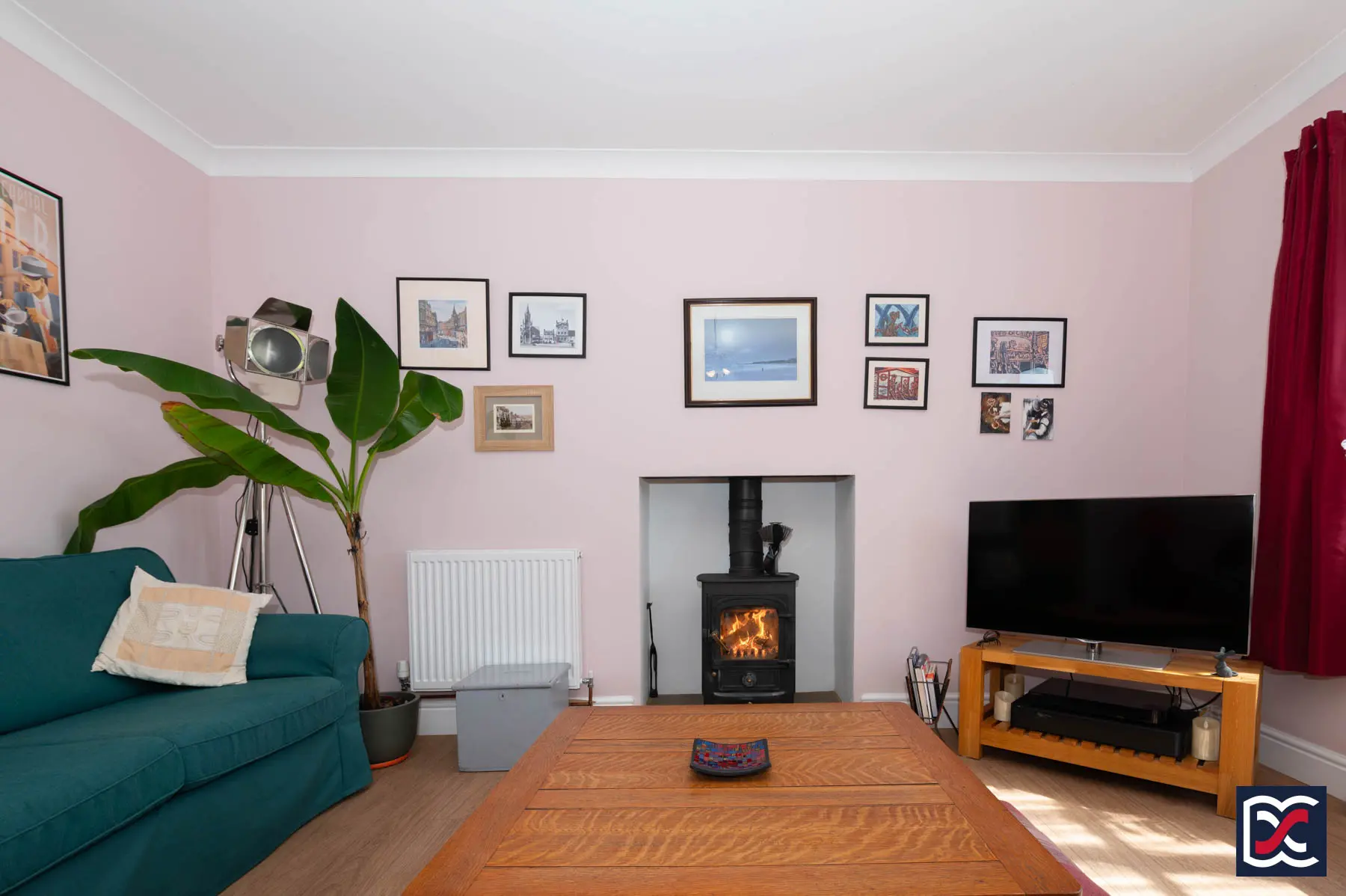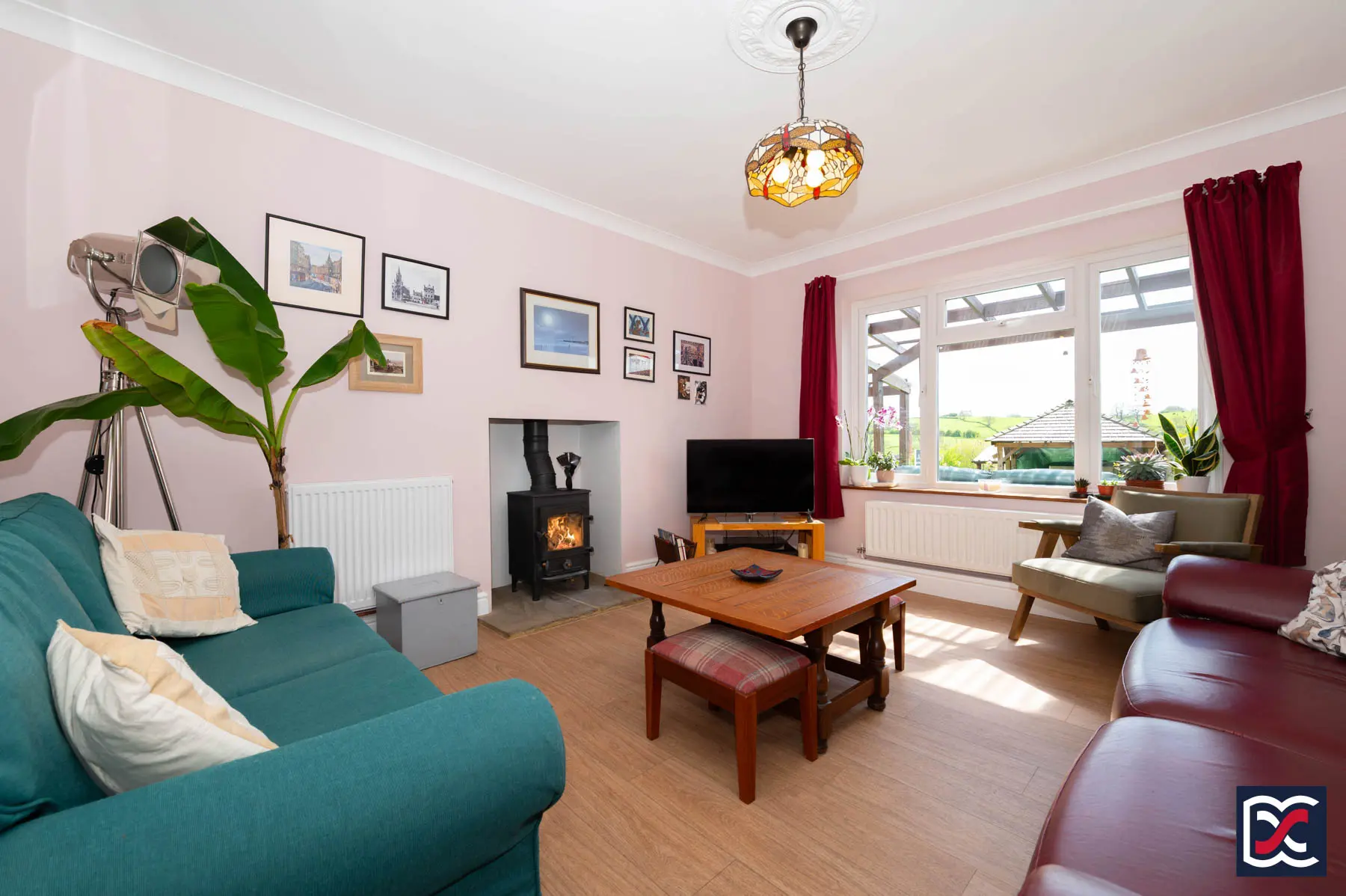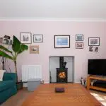 The sitting room is a well-proportioned reception space, centred around a large four-unit casement window that draws in good natural light and enjoys a south-facing outlook towards the canal and surrounding countryside. The room is tastefully presented and finished with oak-effect flooring, while a recessed fireplace with a riven stone hearth houses a Clearview stove, forming an attractive focal point.