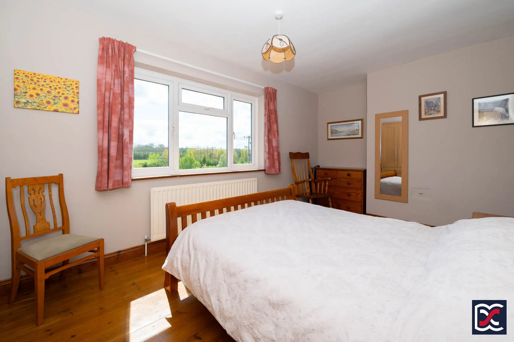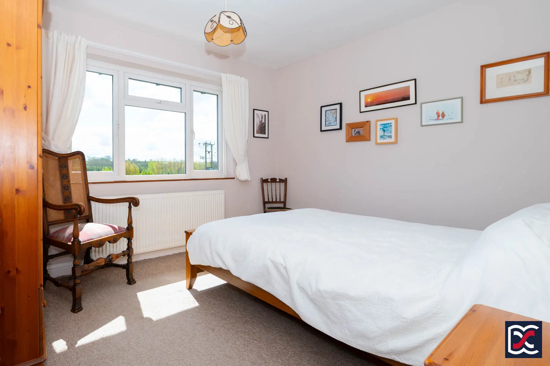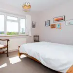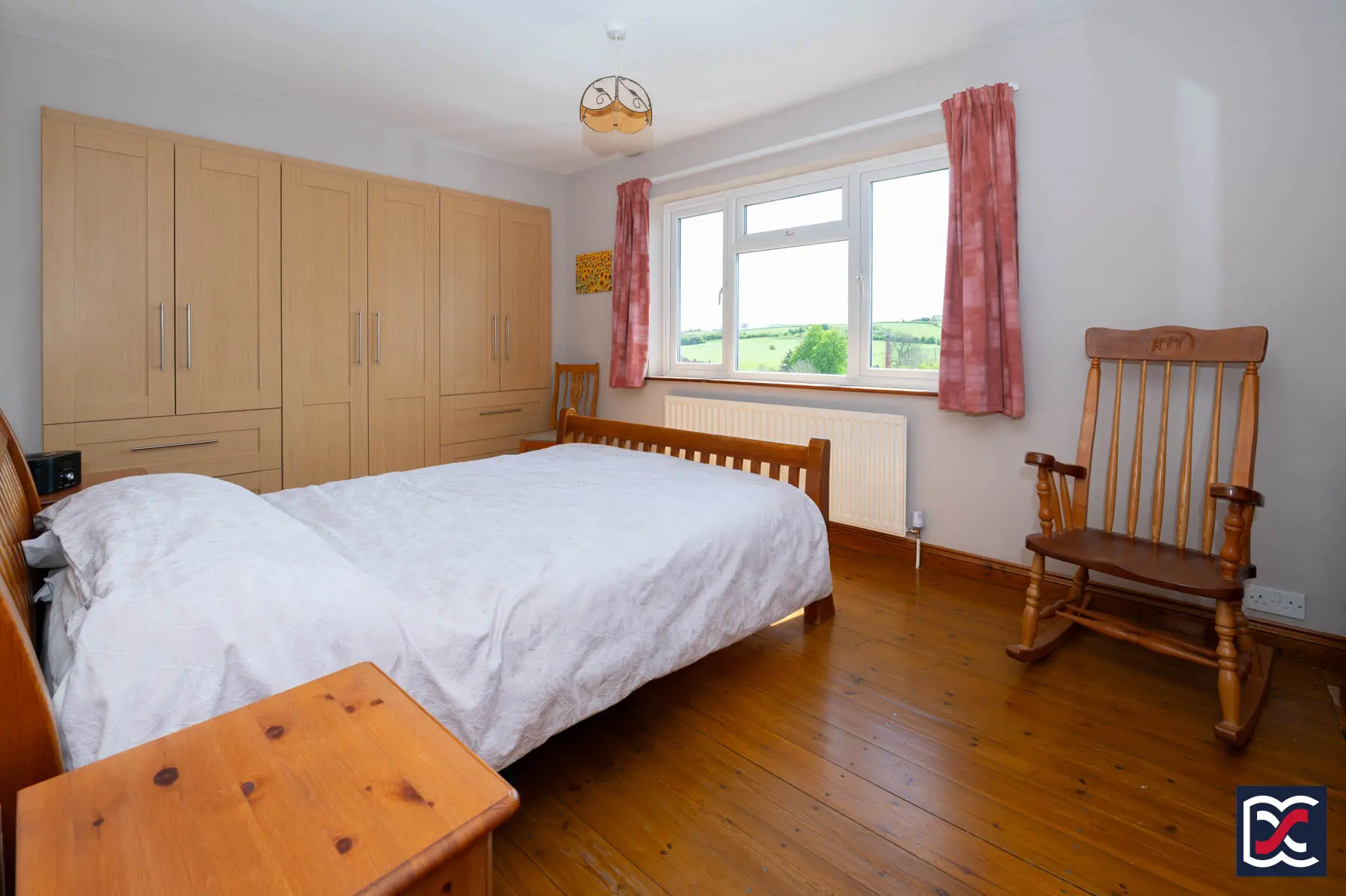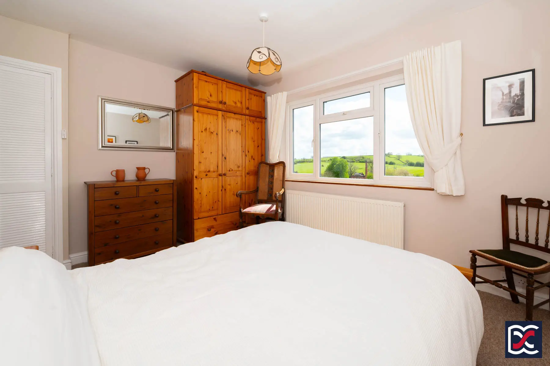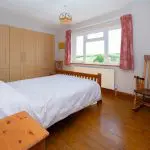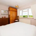 A further well-proportioned double bedroom with a large four-unit casement window to the south-facing elevation, enjoying an open outlook over the surrounding countryside. The room offers space for freestanding furniture and is finished with loop-pile carpet. A built-in double-door cupboard houses the hot water cylinder and immersion heater.