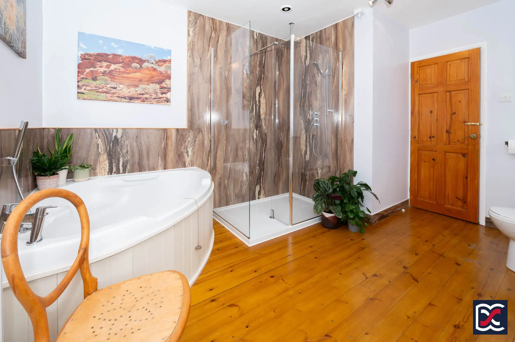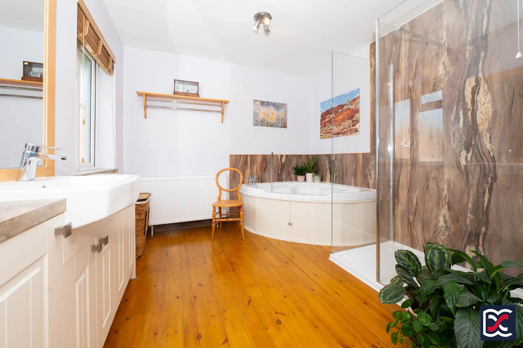 A generously sized bathroom, well-lit by two separate frosted casement windows to provide natural light and ventilation. The room is tastefully presented and fitted with a four-piece suite comprising a large corner bath with integrated seat, chrome mixer tap and handheld shower attachment; a walk-in shower with glazed screen, rainfall shower head and separate handheld shower; a WC with concealed cistern set within a bespoke vanity unit; and a ceramic wash hand basin with chrome taps, also incorporated into the vanity cabinetry, which provides useful storage. The floor is finished in varnished original pine boards, and mechanical extract ventilation is also installed.