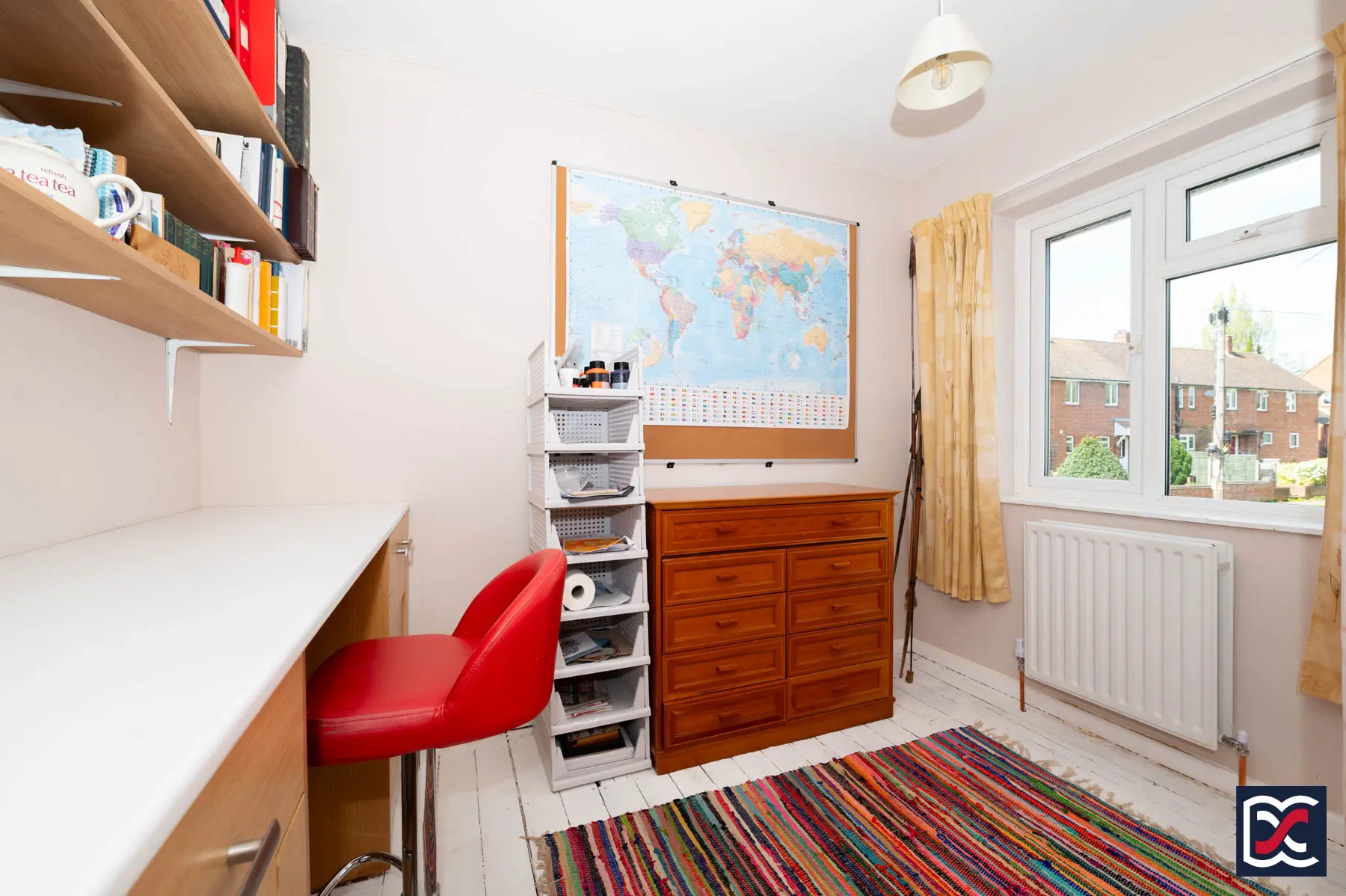 A versatile single bedroom, currently arranged as a home office, but equally suited for use as a guest bedroom or nursery. A three-light window to the front elevation provides natural light, while floors are painted pine boards and walls have neutral finishes. An overstairs cupboard with fitted shelving provides useful storage, and the current owners have installed a full-width workstation with shelving above to support home working.