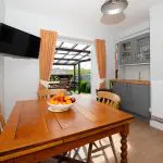 There is a base unit with shelving above, a stainless steel sink with chrome mixer tap, and space for a washing machine beneath. A panelled door opens to the ground floor cloakroom, while a glazed rear door with three-point locking opens directly onto the pergola and raised deck, bringing in natural light from the south-facing aspect.